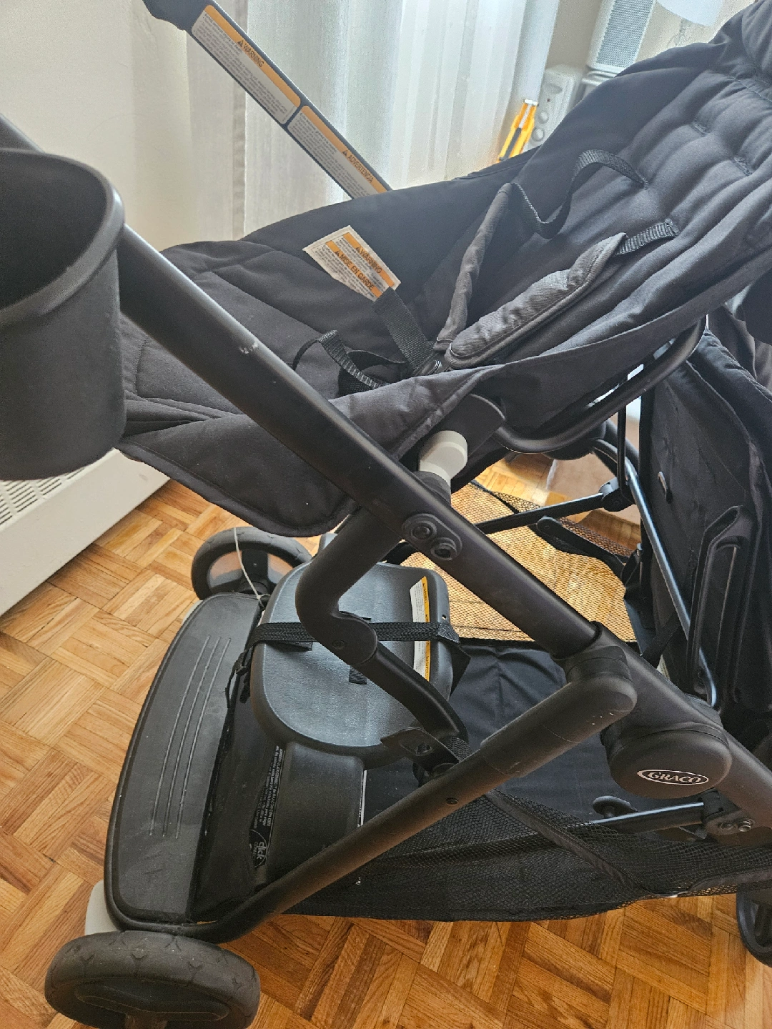 Selling a Graco stroller in great condition! It's black and ready for a new family to enjoy. Perfect for walks around the neighbourhood or trips to the park. It has a spot for a drink and a place for the little one to stand!