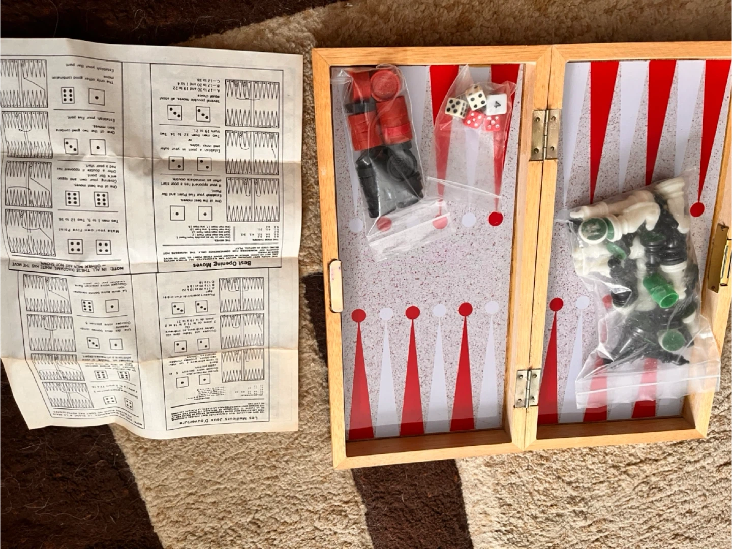 This is a classic 2-in-1 game set featuring both chess and backgammon boards. It includes all the necessary checkers, dice, and instructions for gameplay. The wooden construction makes it a durable addition to game night!