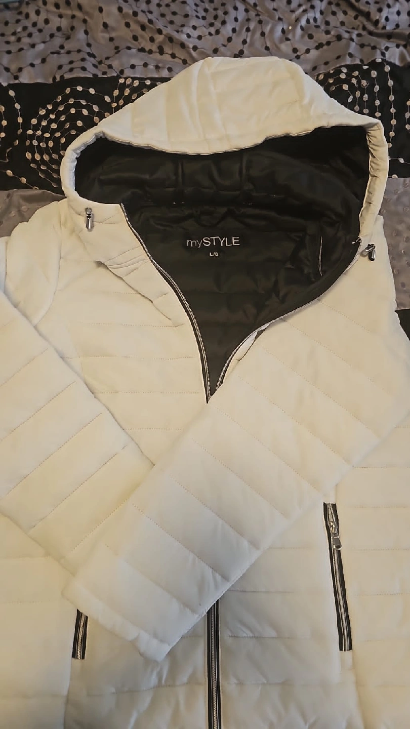 10Selling a mySTYLE white puffer jacket in size L/G. It has a black lining and a hood. Perfect for staying warm during the cooler months!