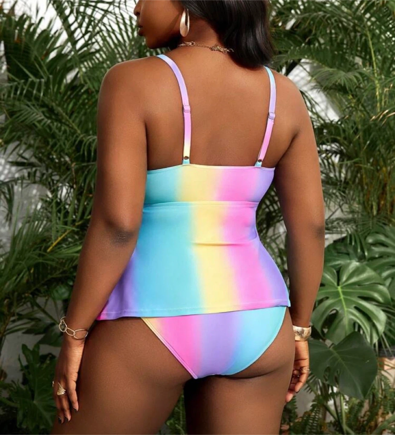 This tankini swimsuit features a vibrant tie-dye pattern with a twist-front design. It's a two-piece set with adjustable straps and a comfortable fit. Perfect for sunny days at the beach or pool!