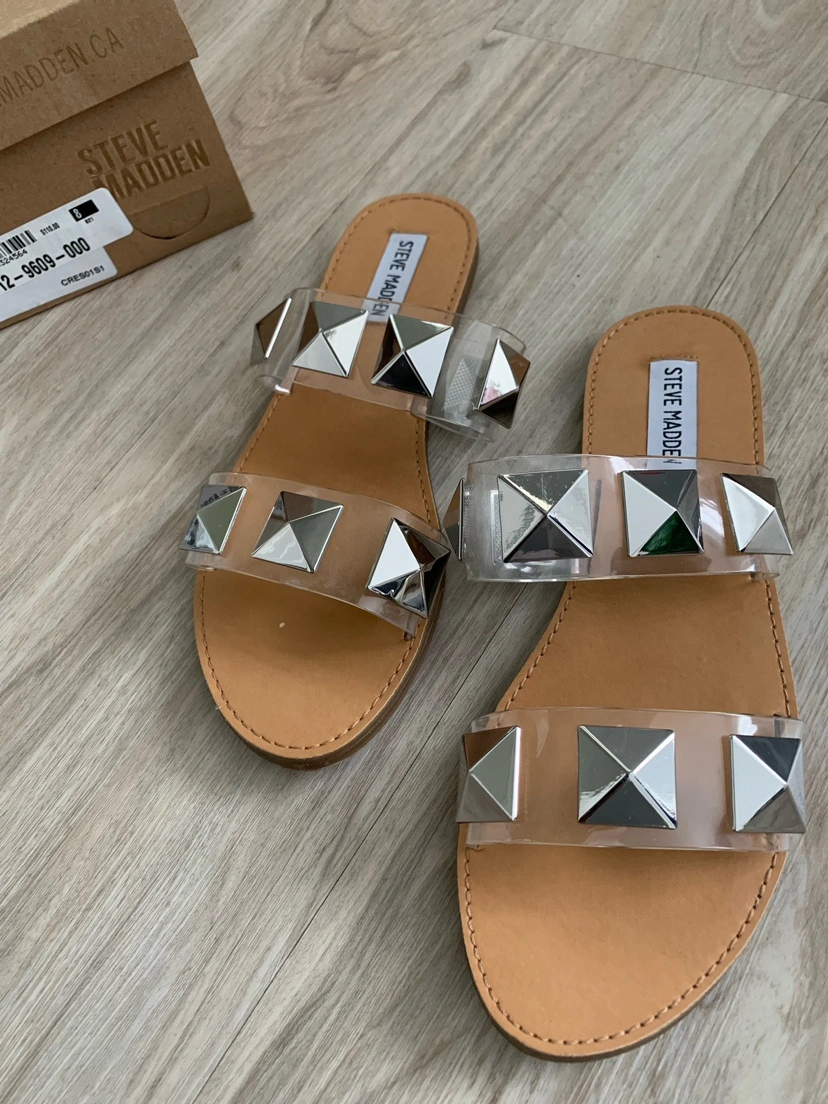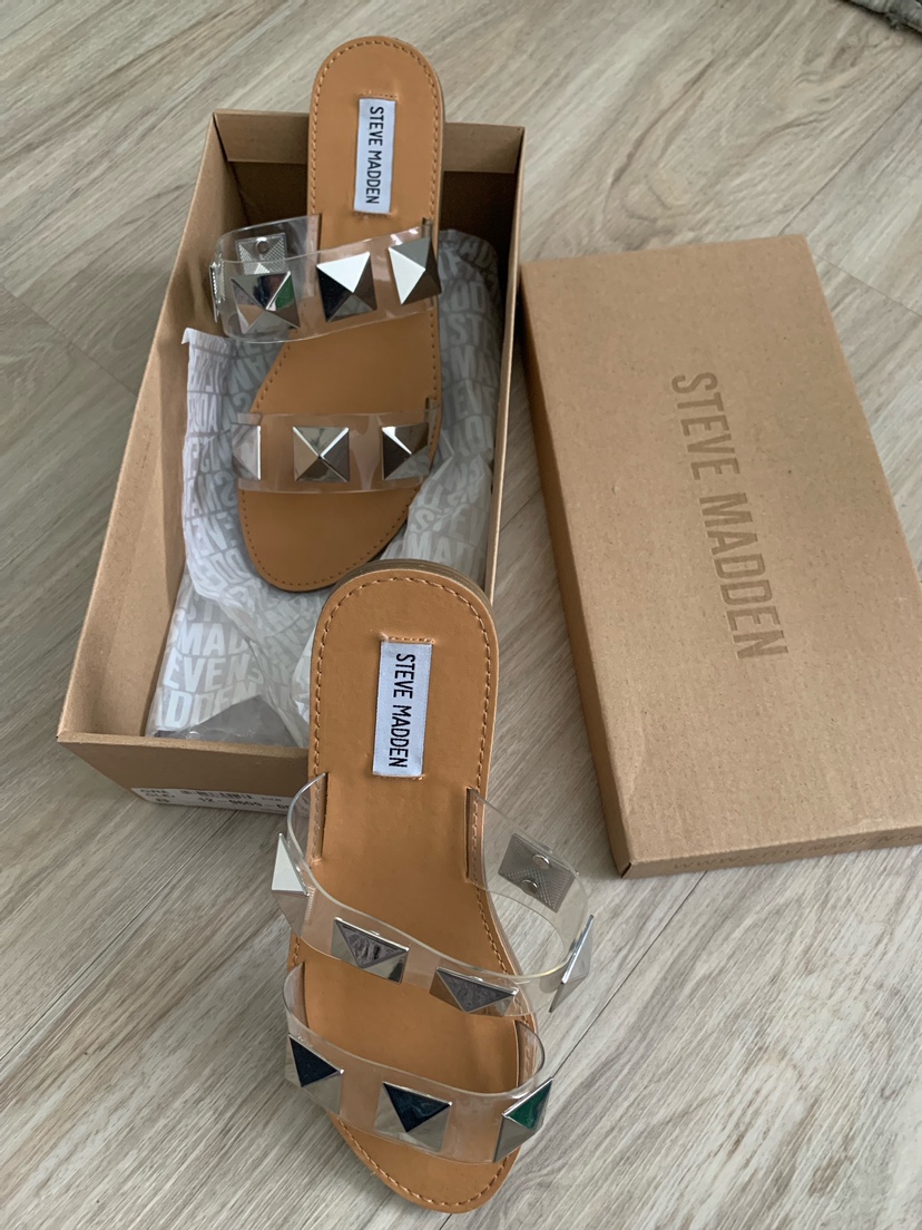 These sandals are clear with silver studs and are in the original box. They have two straps across the top and a padded footbed. Worn twice.