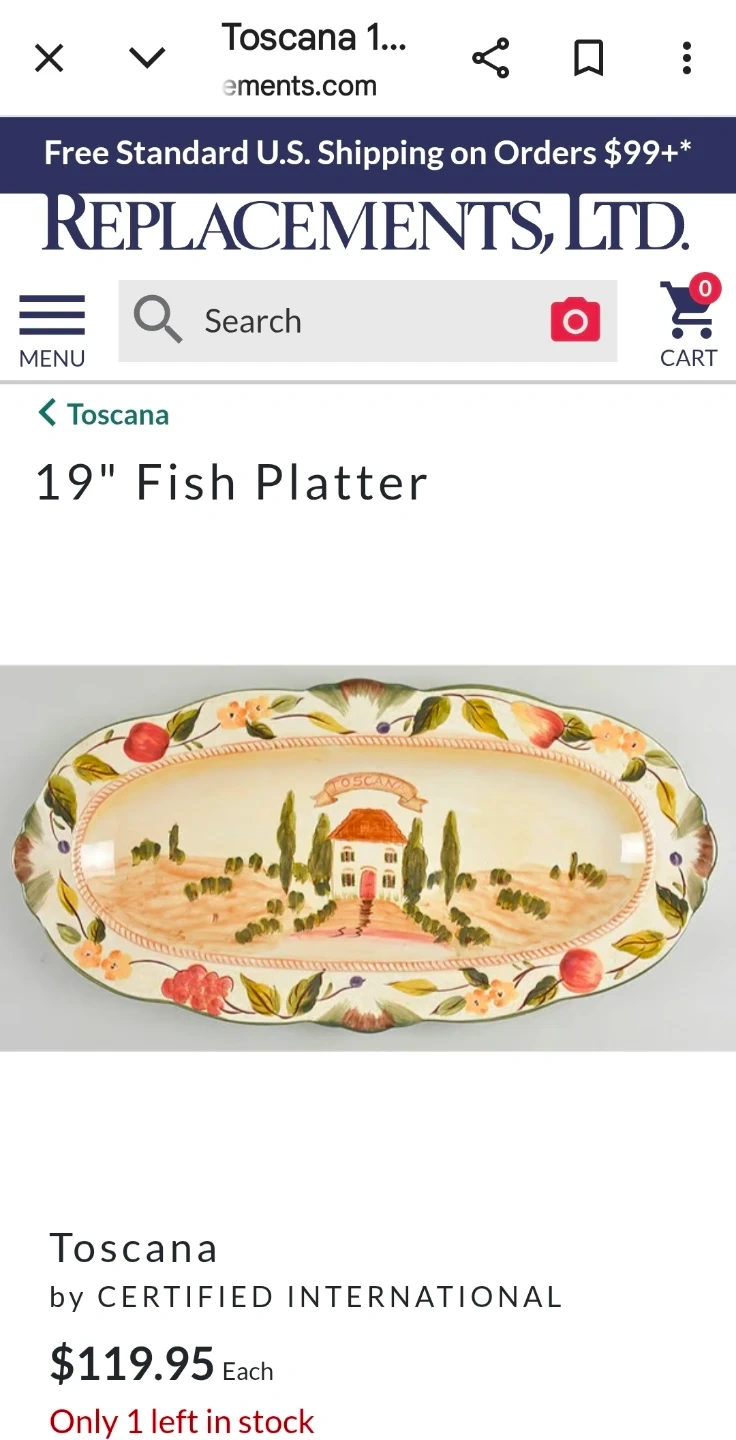 This is a 19-inch fish platter from Toscana. It features a charming Italian countryside scene with a house and fruit border. This platter's decorative design makes it a lovely serving piece for special occasions.