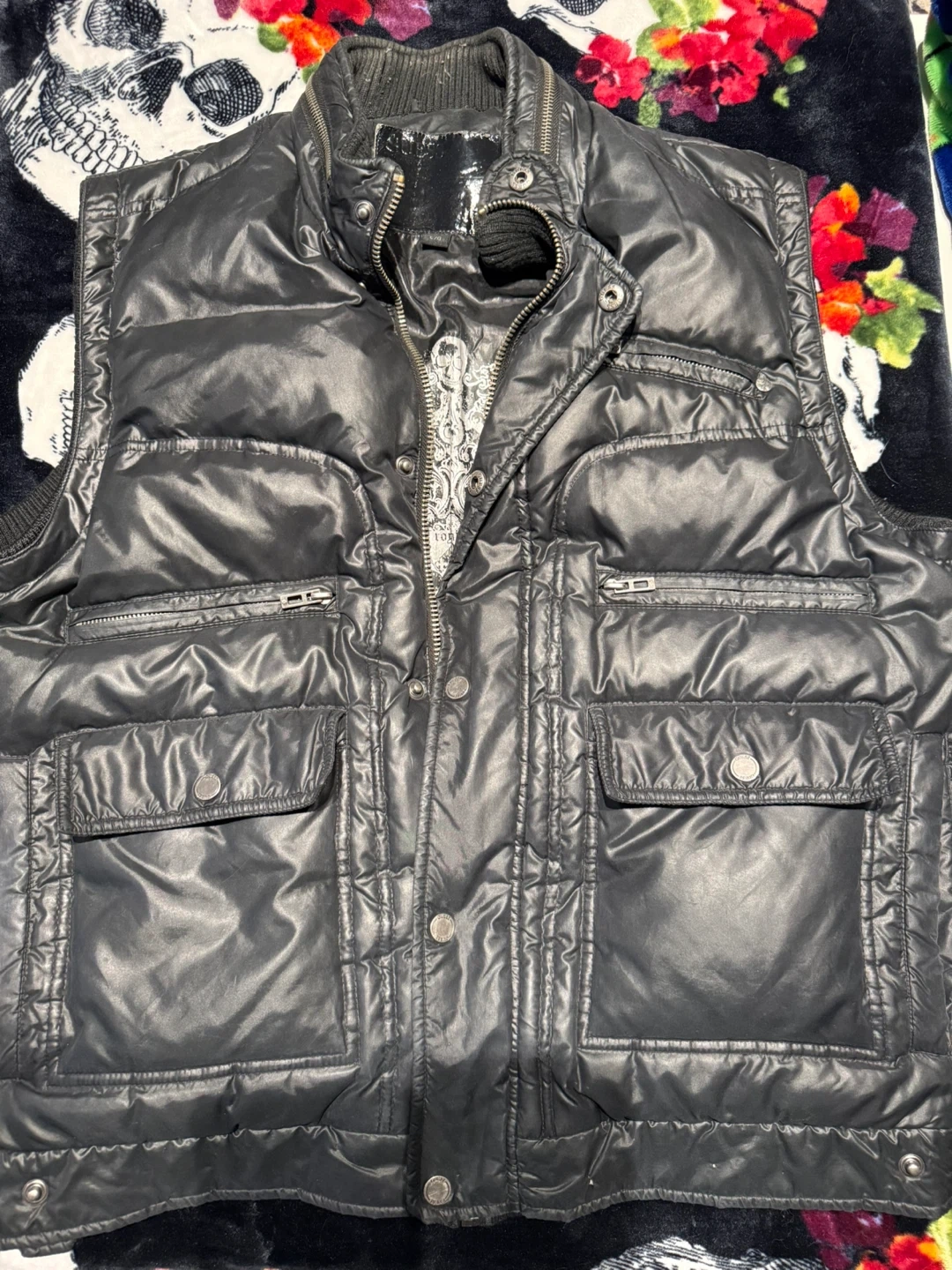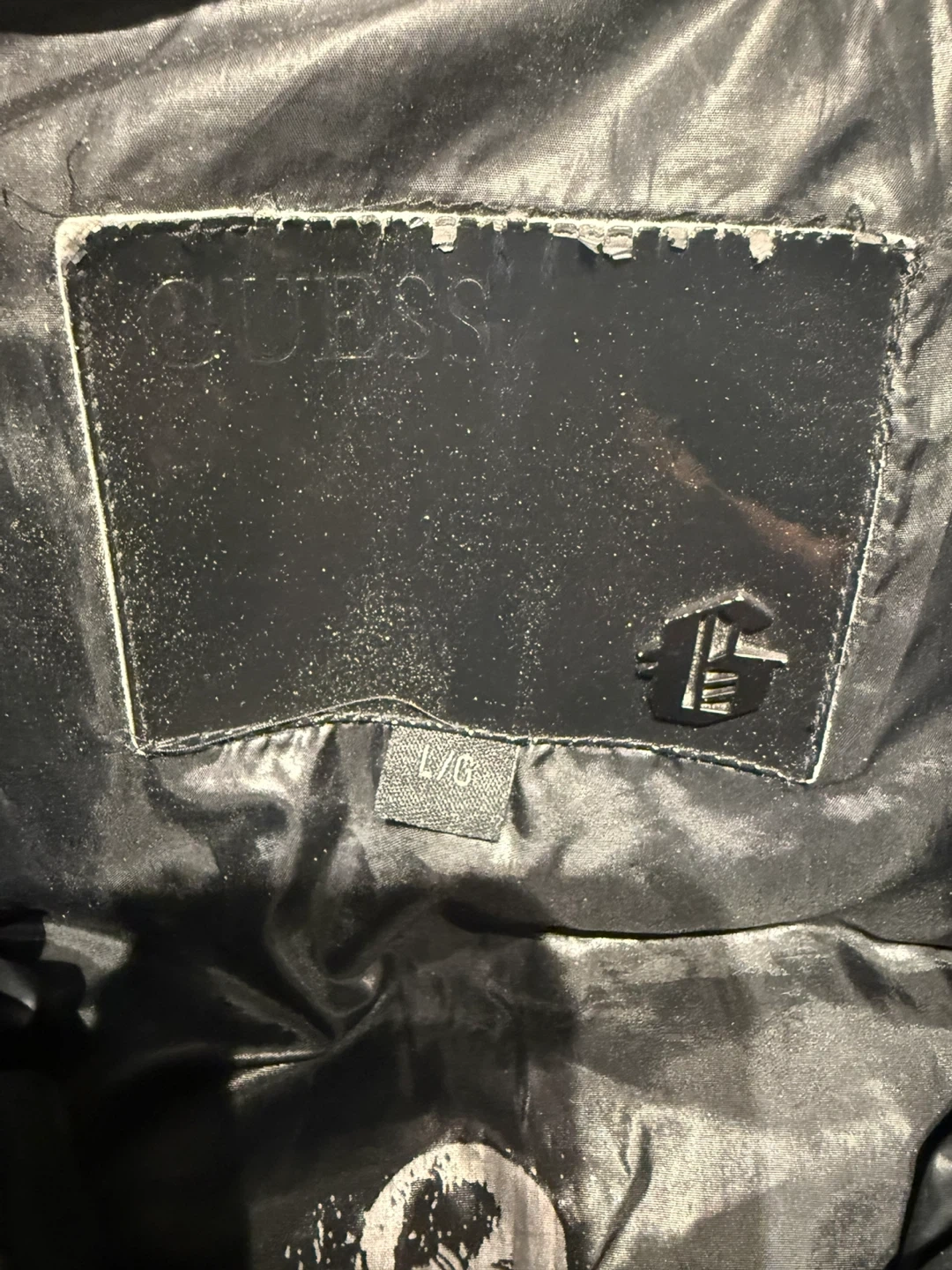 A black Guess puffer vest. It's a size L/G. This vest has a zip-up front and multiple pockets.