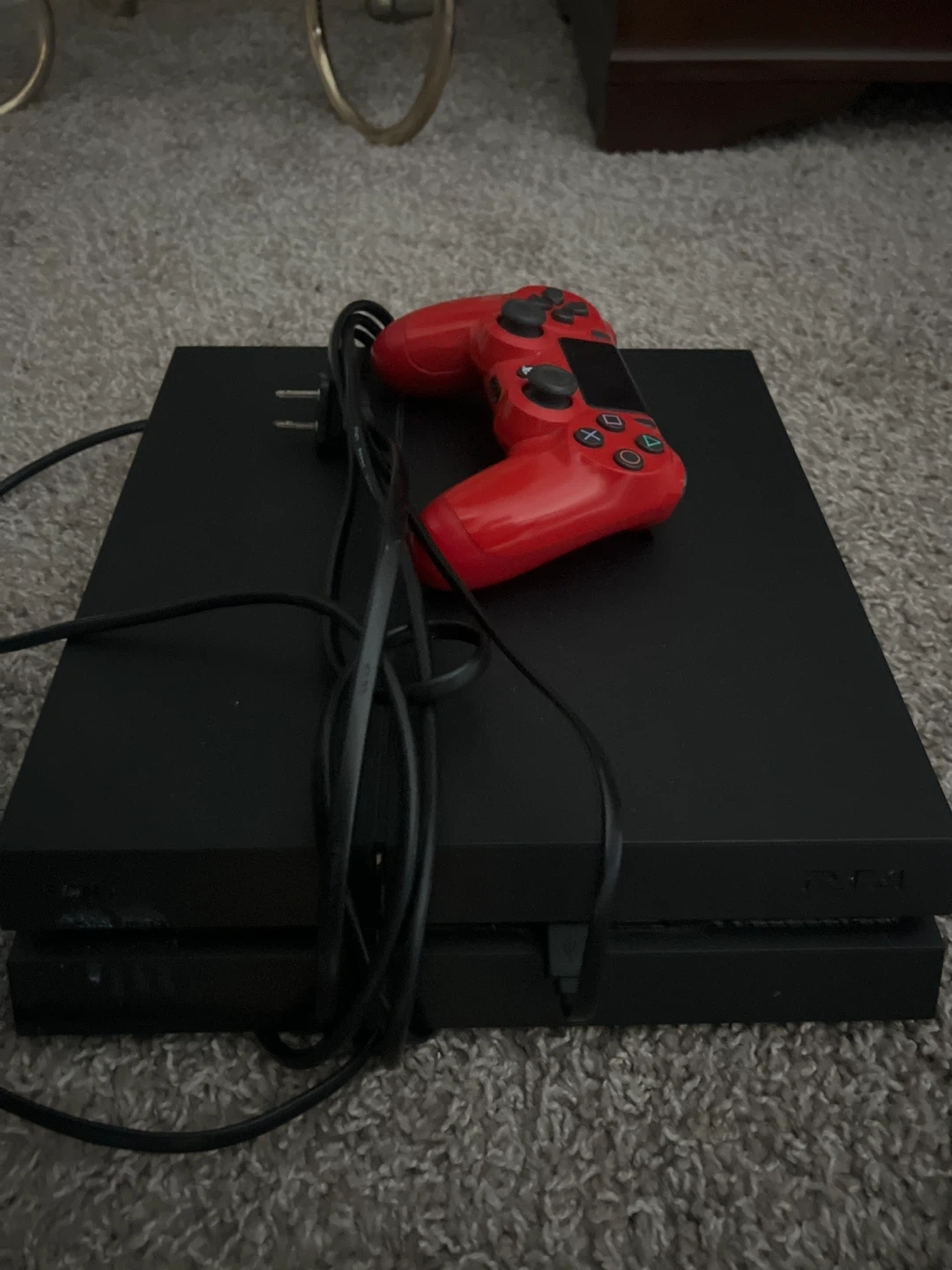 This is a black PlayStation 4 console. It comes with a red wireless controller and necessary cables. Ready for gaming!