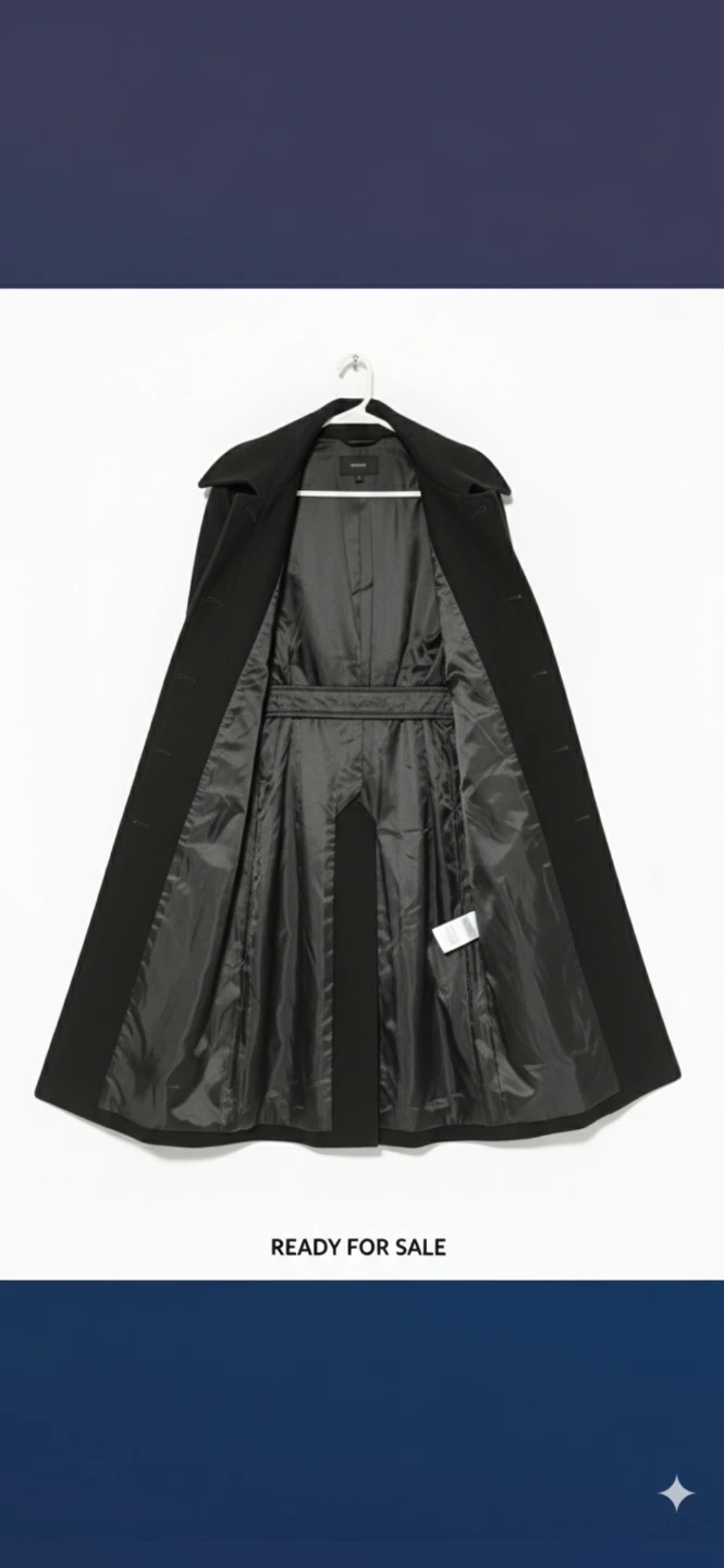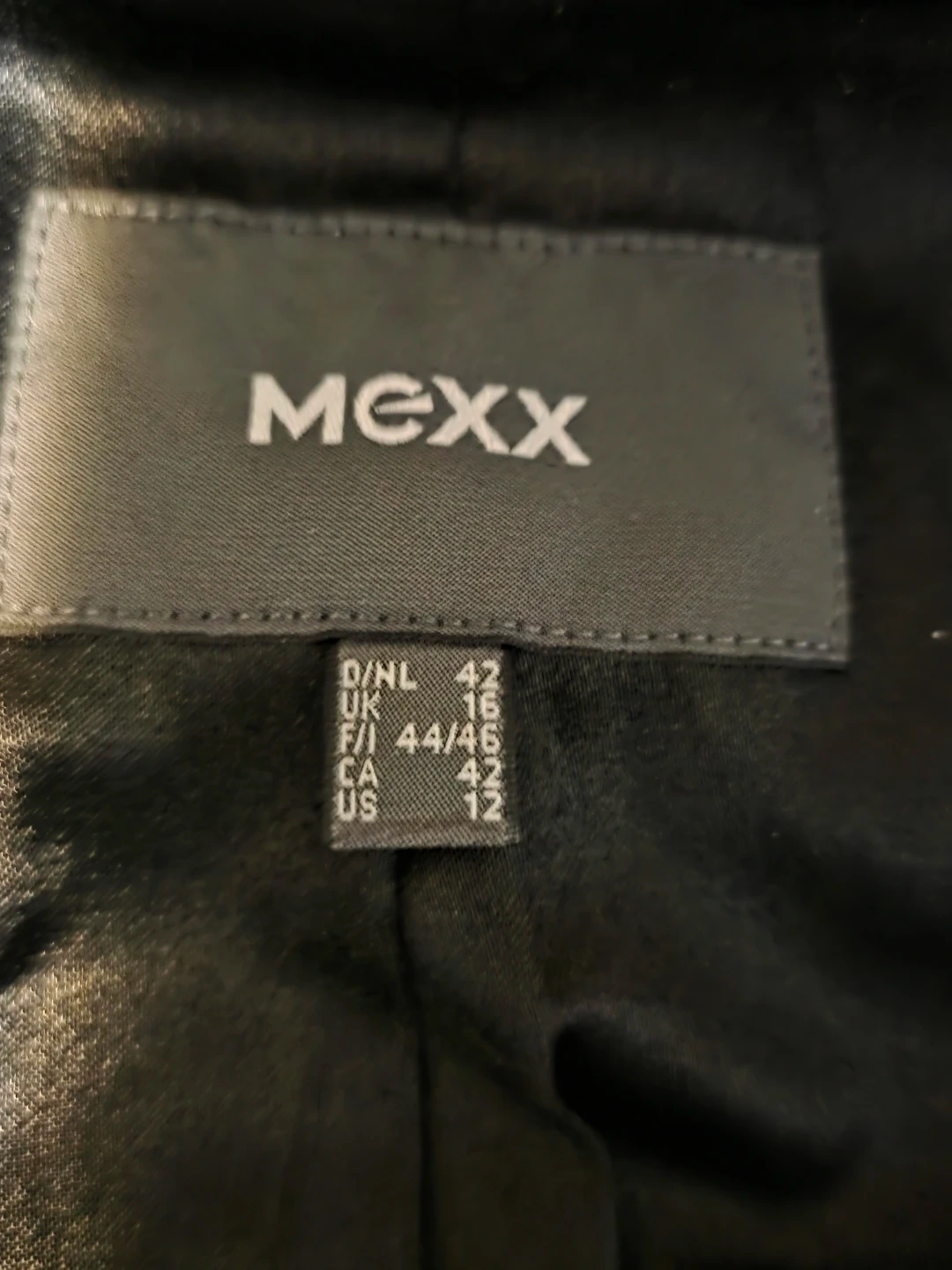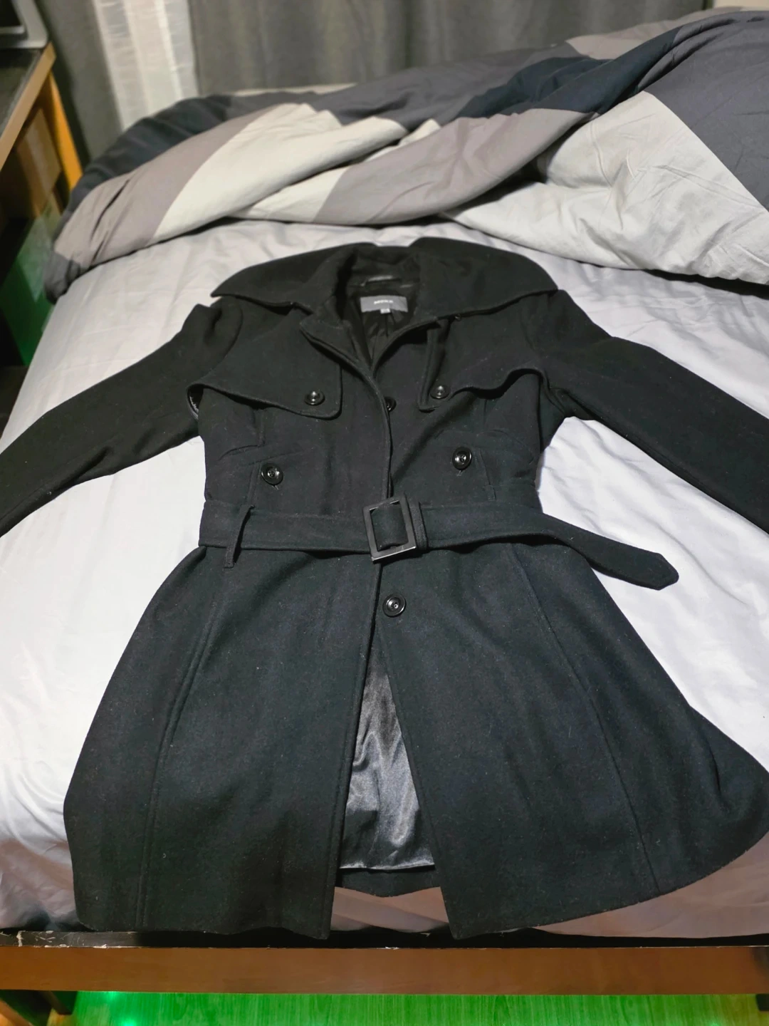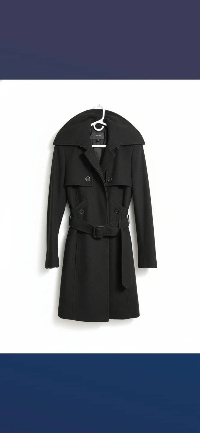 This Mexx trench coat is crafted from a black wool blend. It features a belted waist and a classic collar. A stylish outerwear piece perfect for cooler weather!