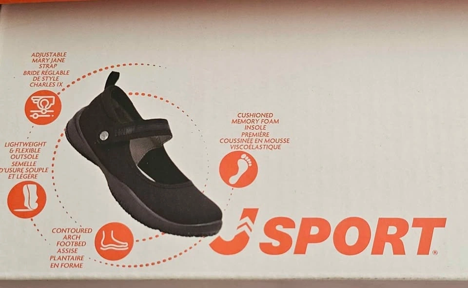 Thank you for considering these comfy black J SPORT Mary Jane flats. Never worn! Brand new in box! These are a Women's size 10M, and have Memory Foam and Arch Footbed for extra comfort. Great for everyday wear. Pick up from a smoke-free home in the McKenzie Lake Douglasdale area in SE Calgary.