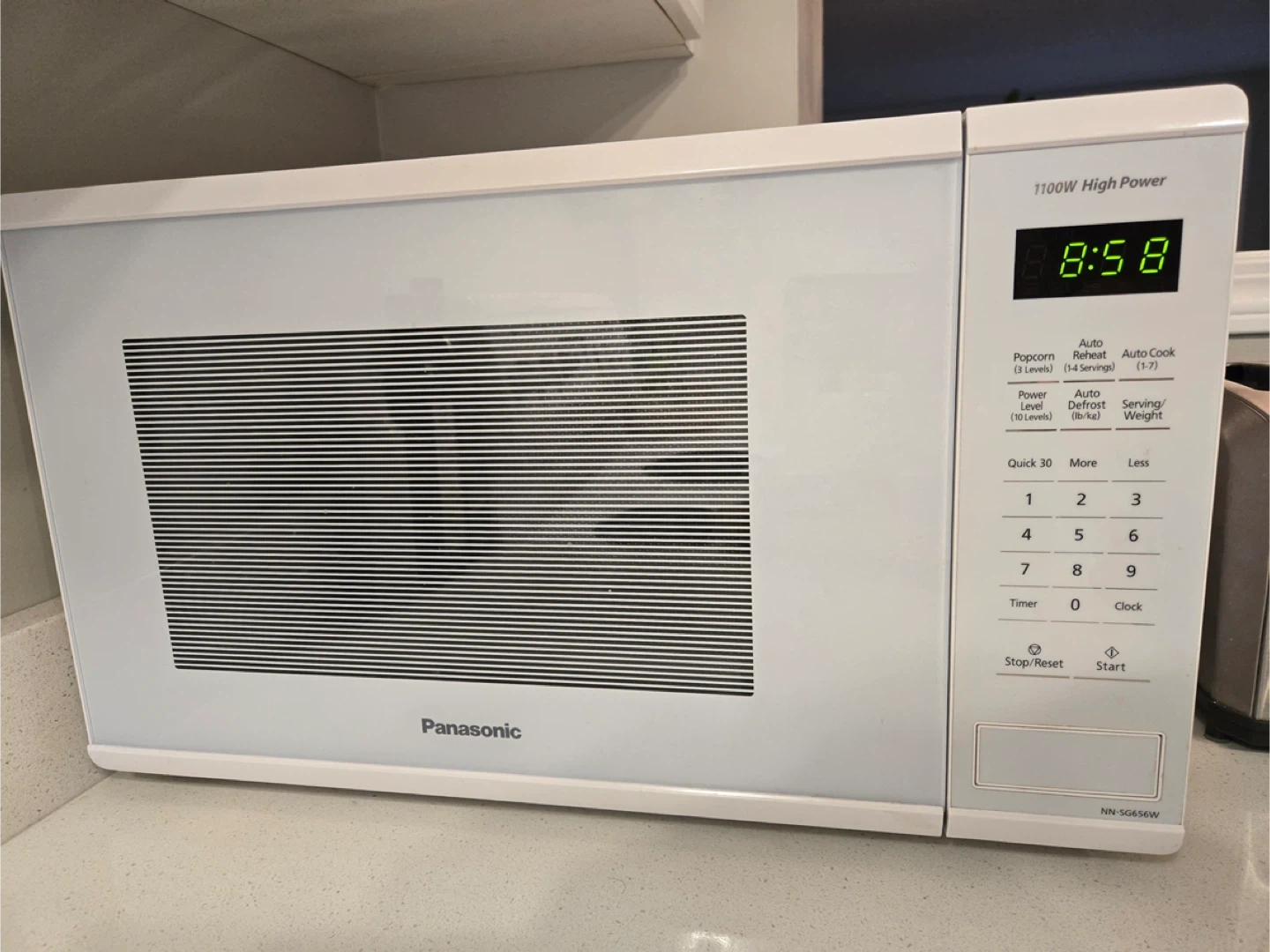 This is a white Panasonic microwave, model NN-SG656W. It offers 1100W of high power and multiple cooking functions like Popcorn, Reheat, and Auto Cook. It also has 10 power levels and Auto Defrost capabilities. Convenient Quick 30 function included!