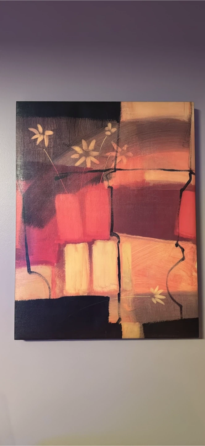 This abstract canvas art features a modern floral design with warm, vibrant colours. It's a lovely piece that adds a pop of colour to any room. Ready to hang, it's perfect for living rooms or hallways!