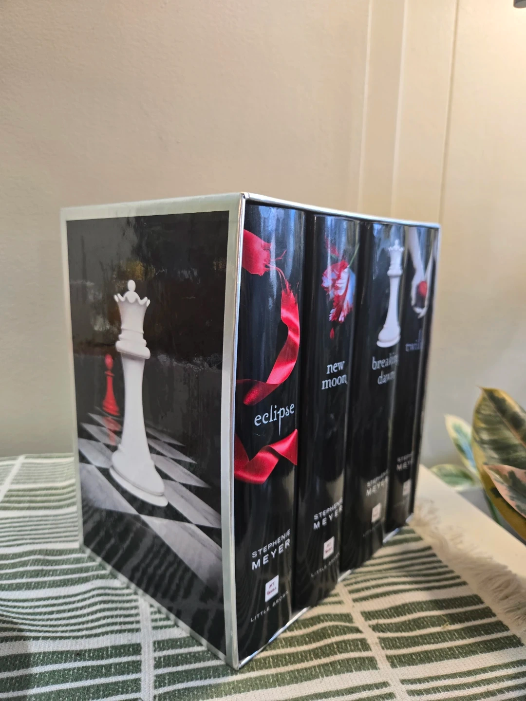 This box set includes the four novels of the Twilight Saga by Stephenie Meyer. The books are Eclipse, New Moon, Breaking Dawn, and Twilight. Published by Little, Brown.