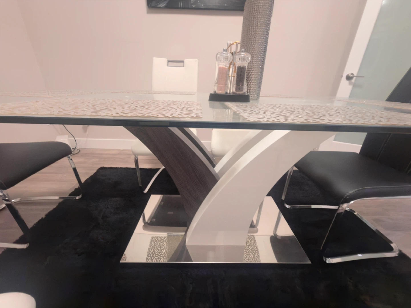 A stylish glass-top dining table with a modern pedestal base. It comes with six chairs, upholstered in black and white faux leather with chrome legs. Perfect for seating family and guests.