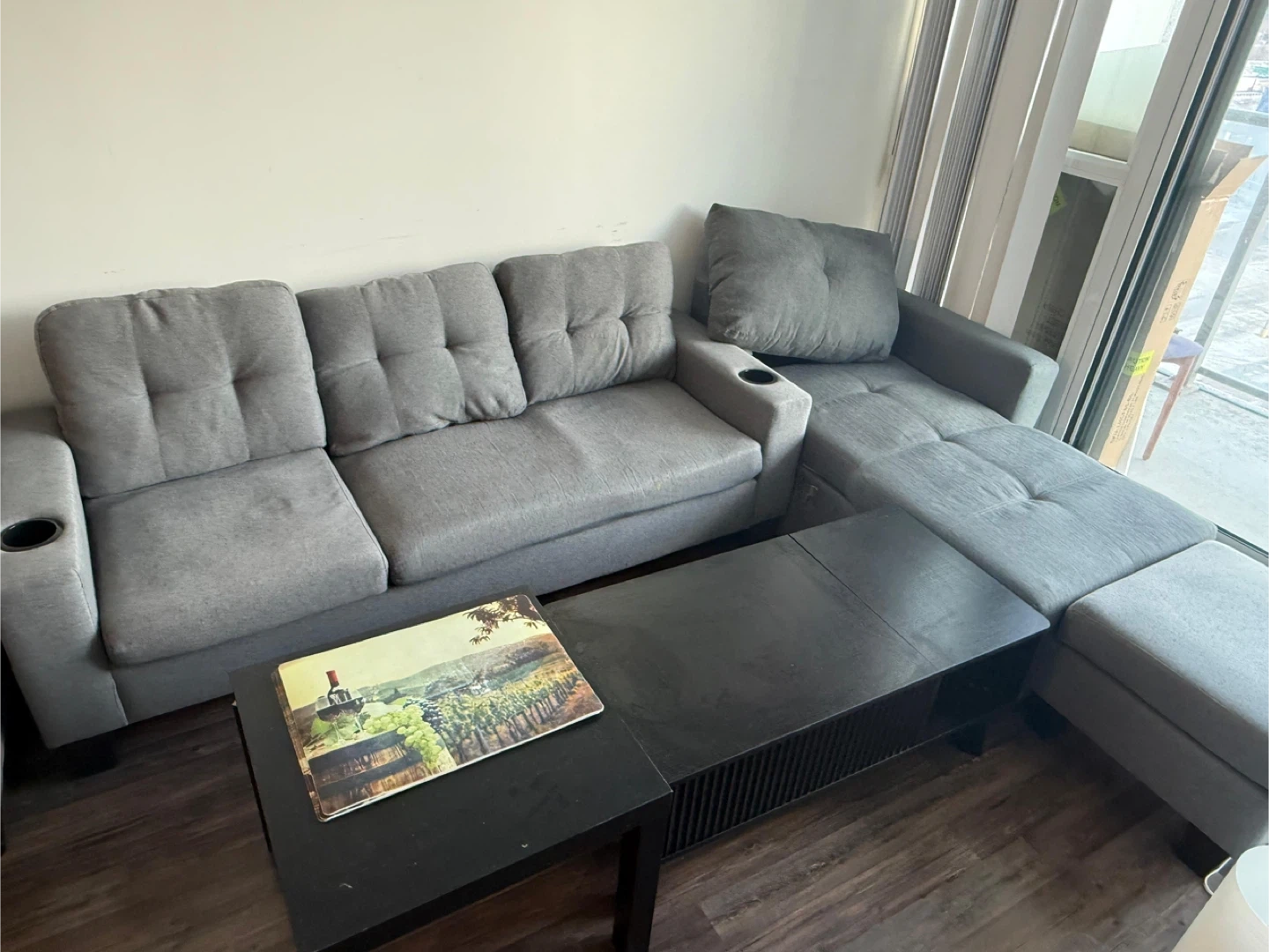 • Grey 3-seater sofa with ottoman along with another side sofa which has storage – $150 (comfortable)