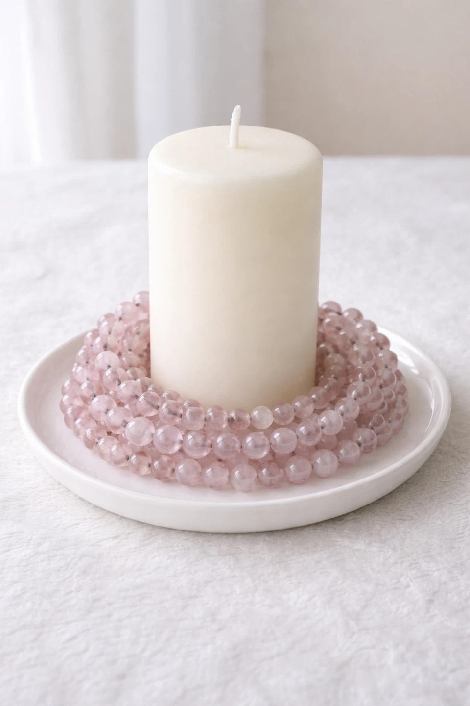 rose, quartz, beads, garland, candle, wrap, boho, decor, crystal, pink, stone, wire, handmade, centerpiece