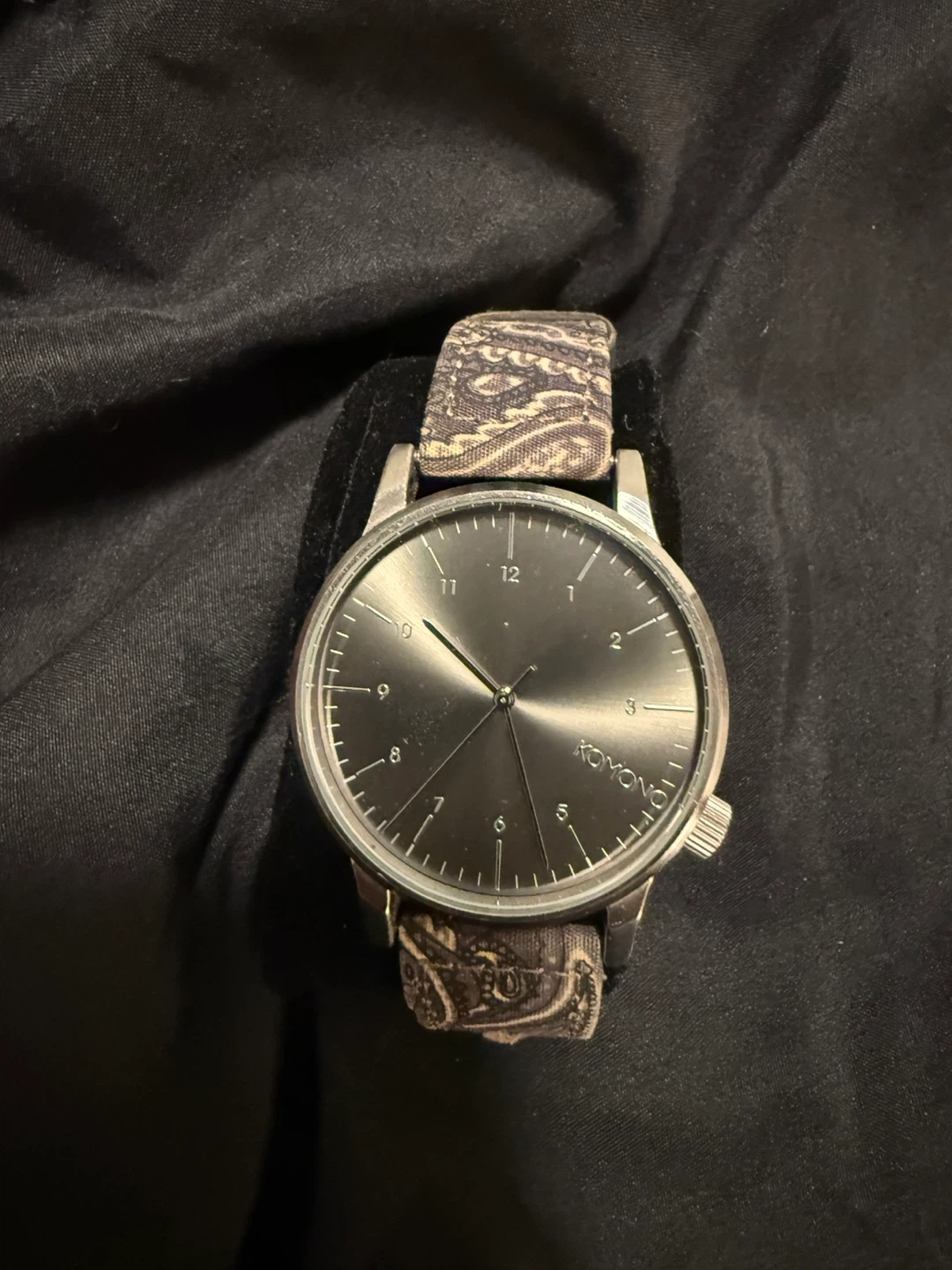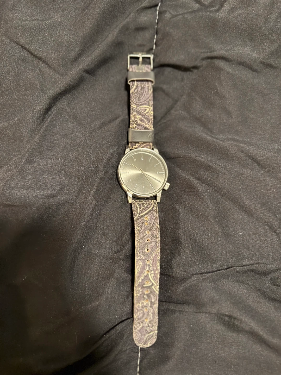 Selling a Komono 'The Winston' watch. It features a water-resistant 3ATM stainless steel back and a Japanese quartz movement. The watch band has a unique paisley pattern. Battery still working.