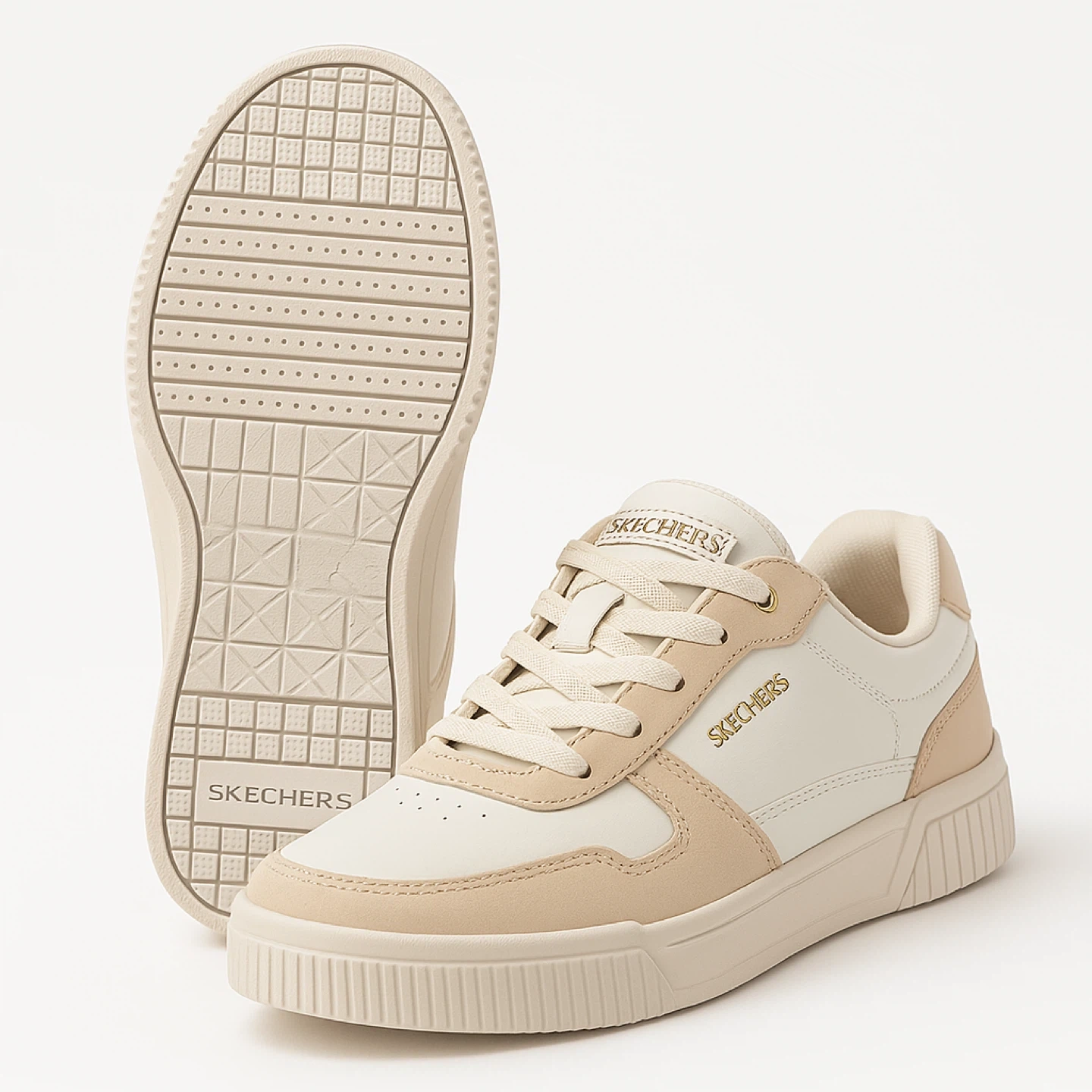 These Skechers sneakers are a stylish off-white and beige colour. They feature a classic lace-up design with gold Skechers branding. Great for casual wear!