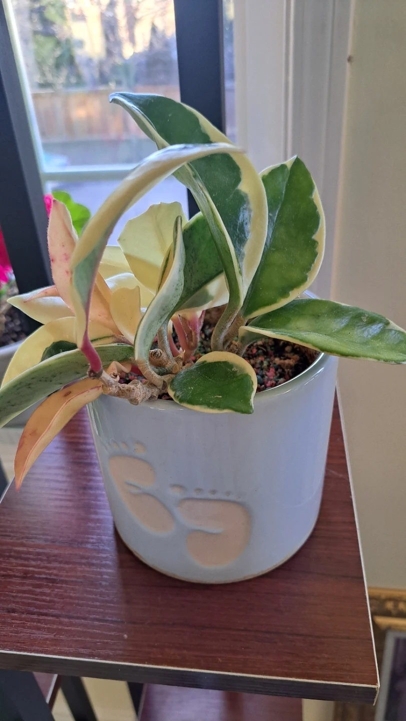 A vibrant Hoya Carnosa Tricolor plant is potted in a light blue ceramic pot with a subtle footprint design. Its variegated leaves show a beautiful mix of green, cream, and hints of pink. This plant adds a touch of natural beauty to any indoor space.