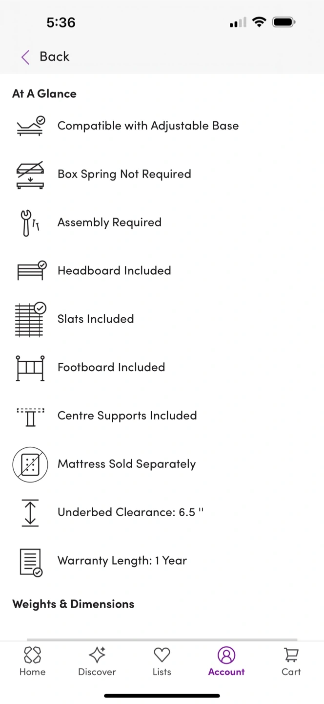 This queen size bed frame includes a headboard, footboard, and slats. It's compatible with adjustable bases and box spring is not required. Underbed clearance is 6.5 inches.