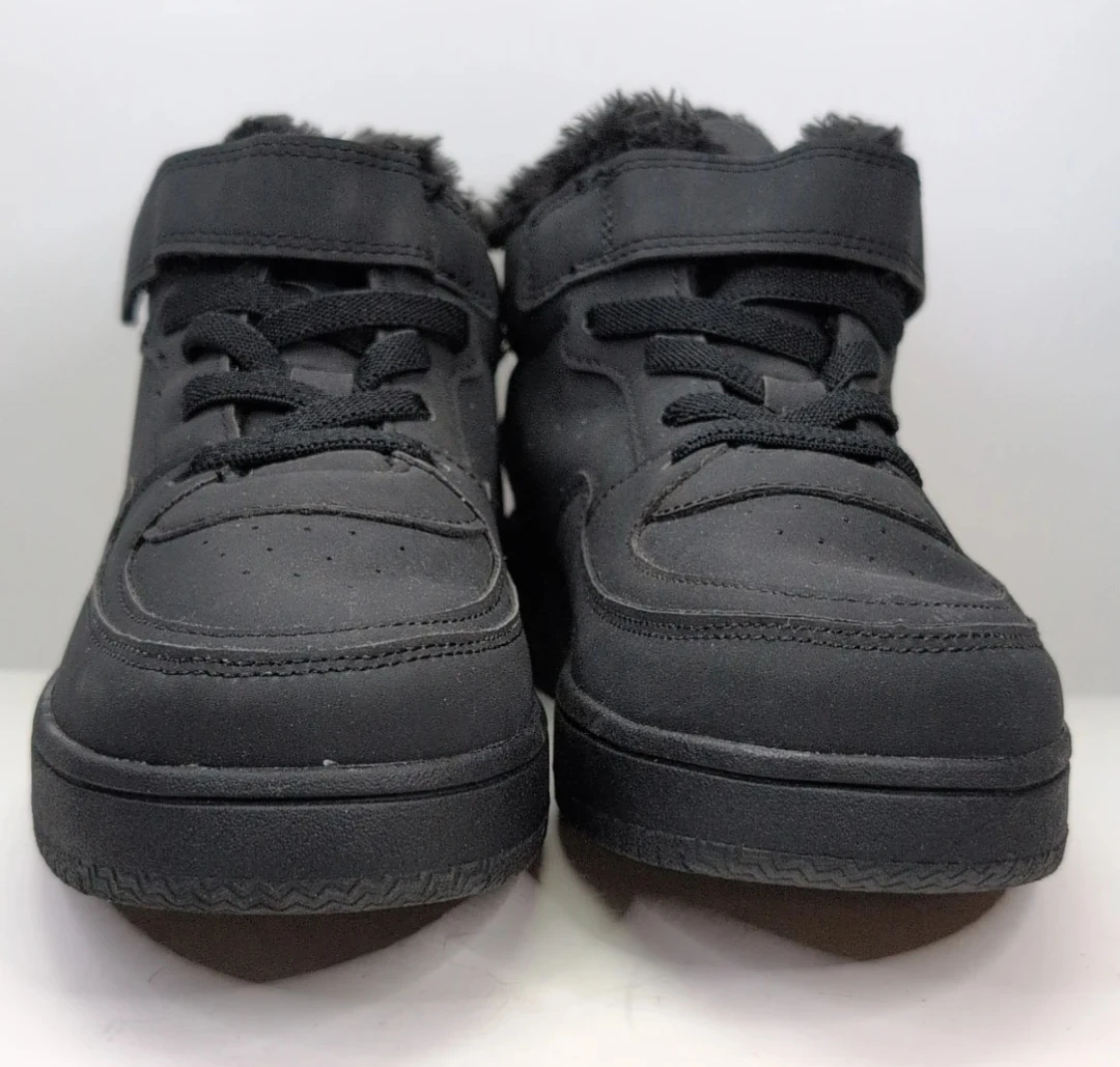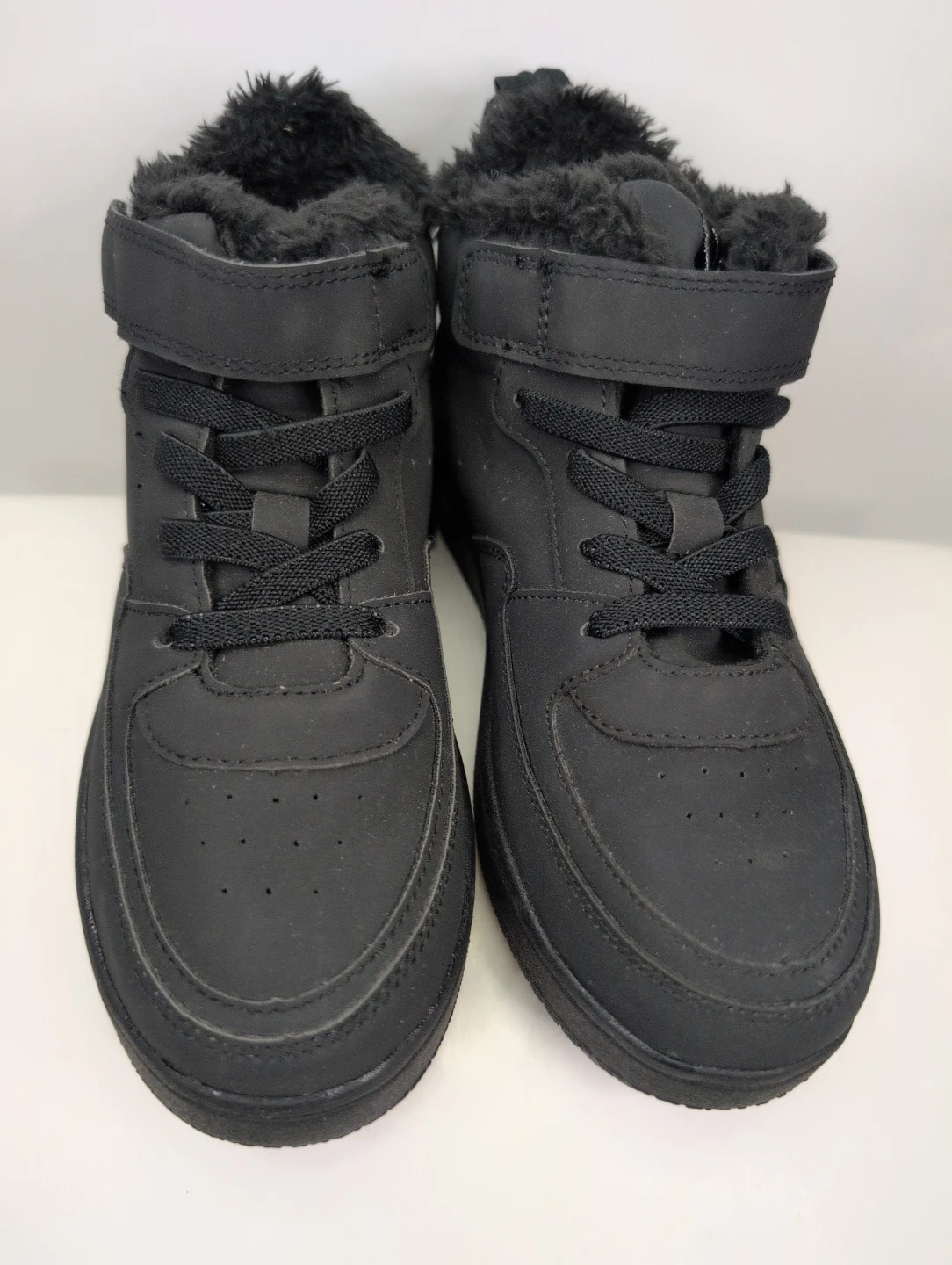 Black winter boots with fur lining. Features a hook-and-loop strap and lace-up closure. EUR 33 size.