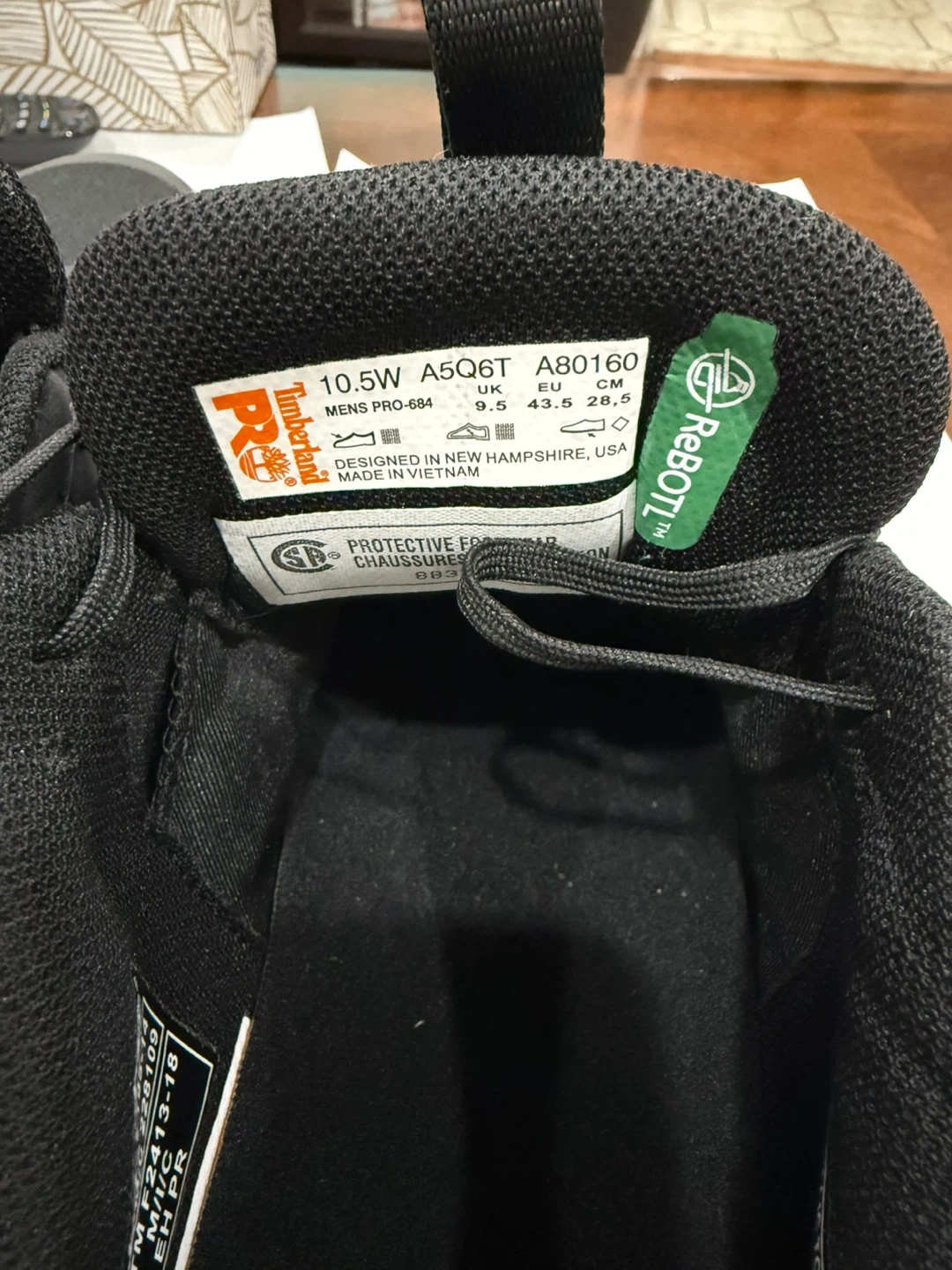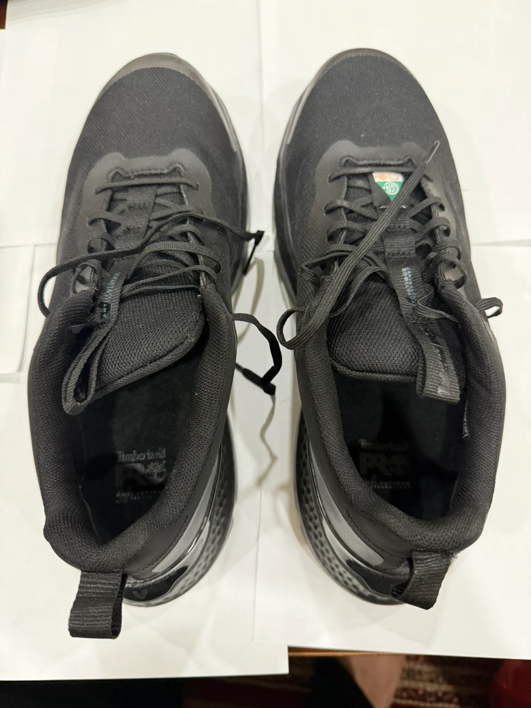 Timberland PRO safety shoes in black. Designed in New Hampshire, USA and made in Vietnam. Features ASTM F2413-18 standards. These shoes offer protective footwear for work environments.- brand new never worn