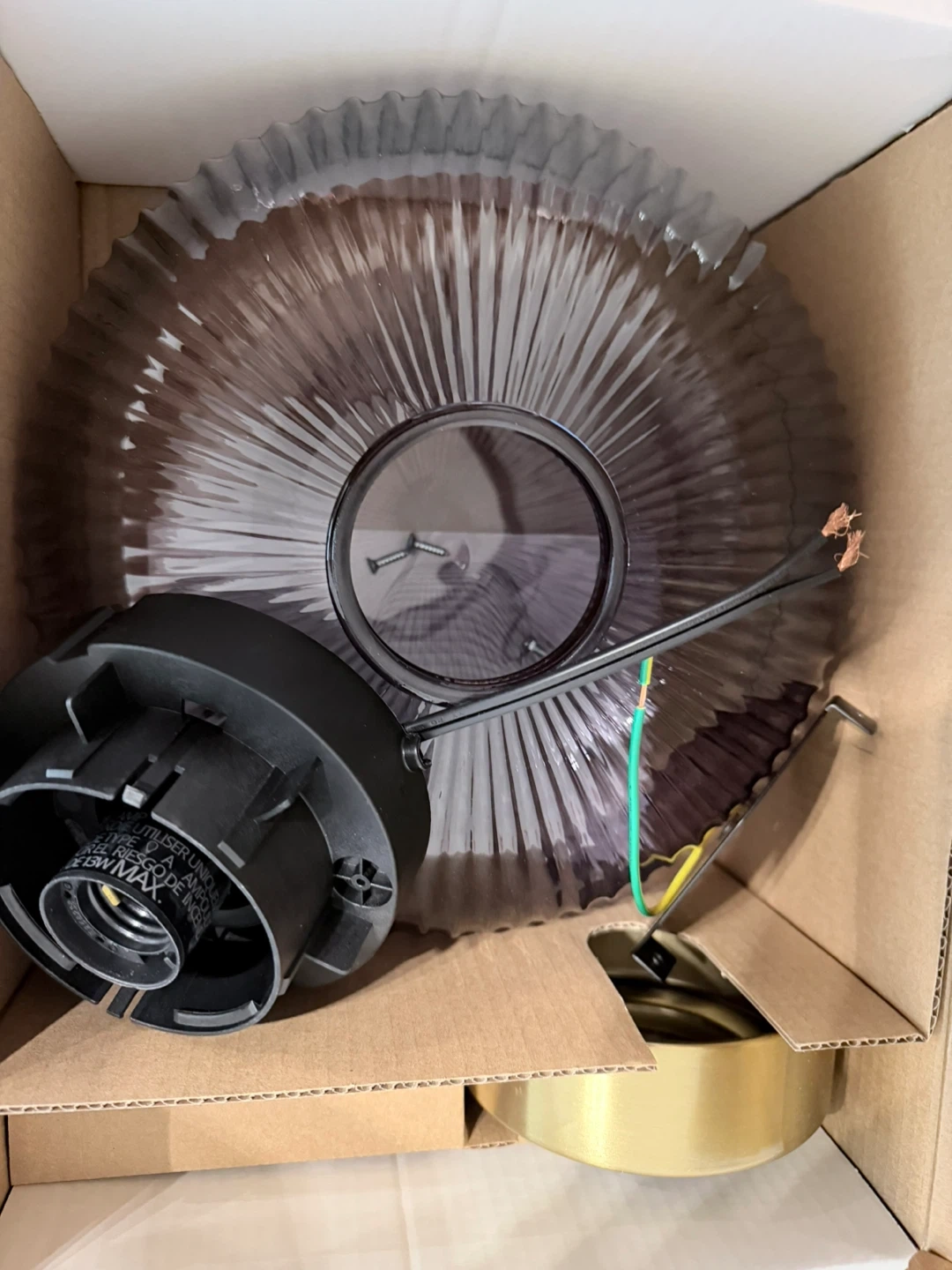 This is the IKEA SOLKLINT pendant lamp. It's designed for an E26 bulb, with a maximum of 13W. The ribbed glass shade provides a decorative light effect. It includes the mounting hardware.