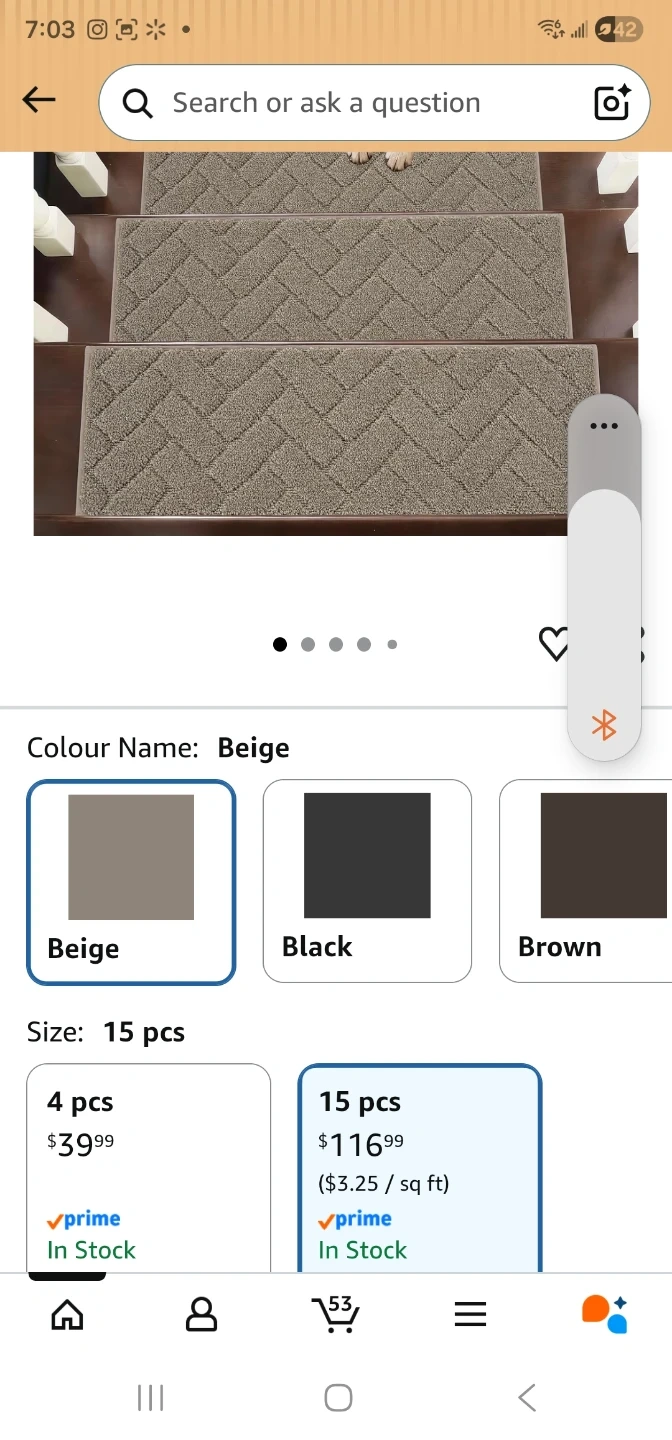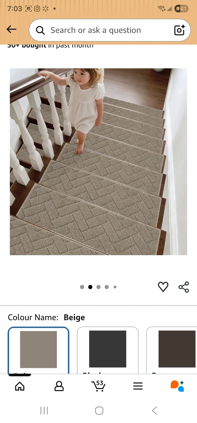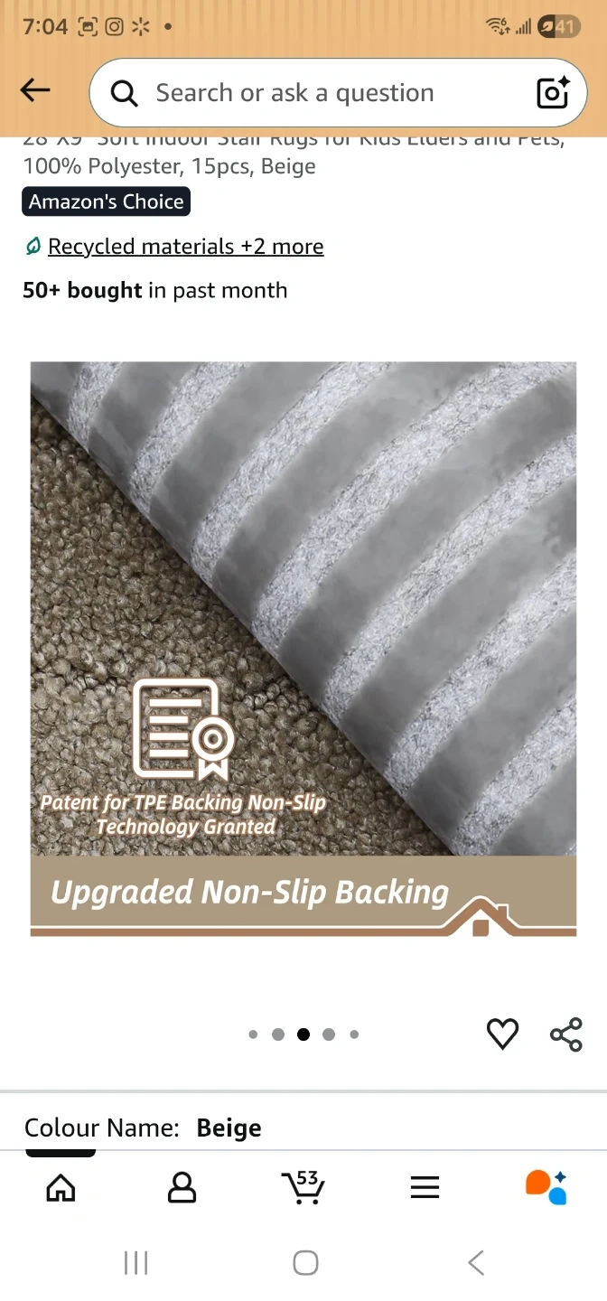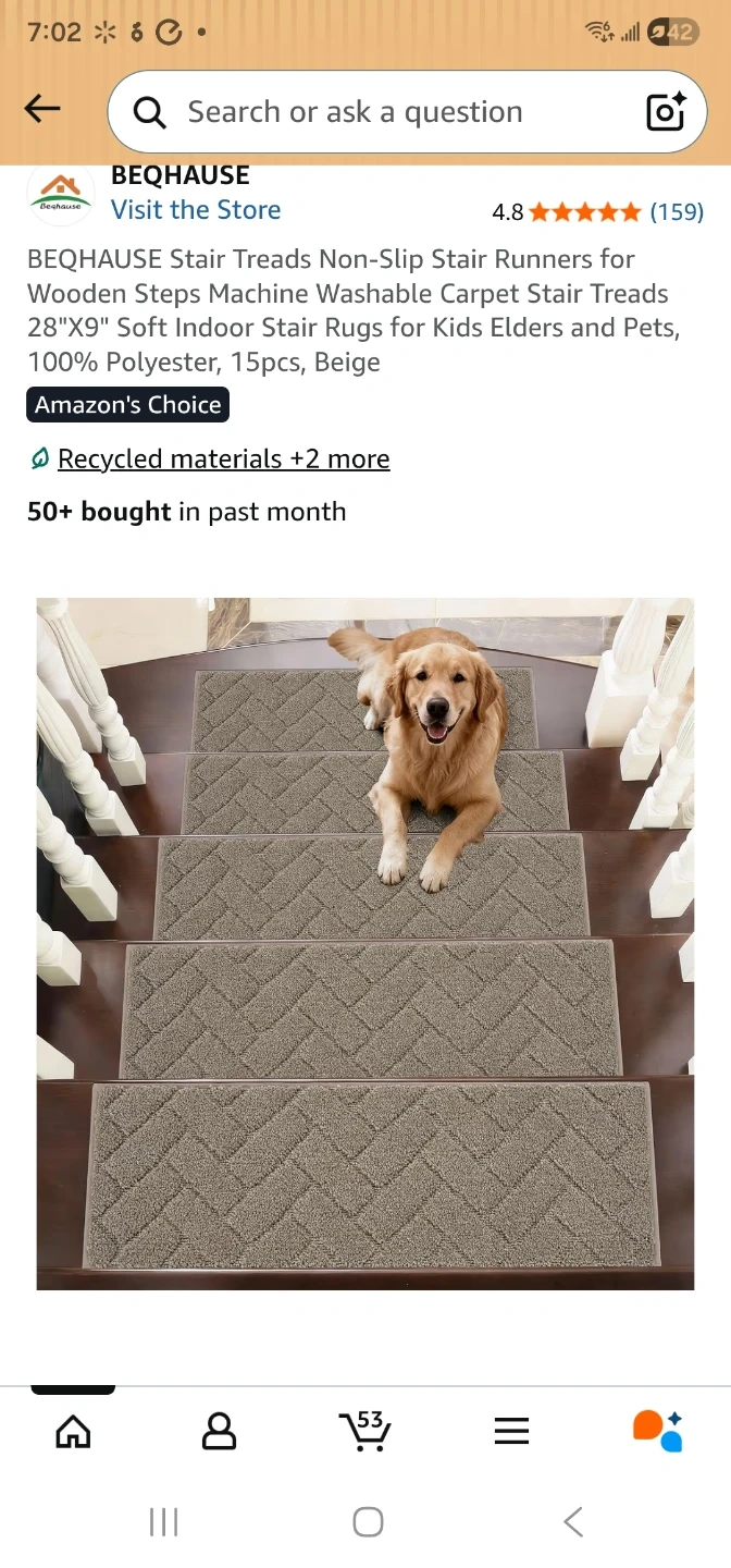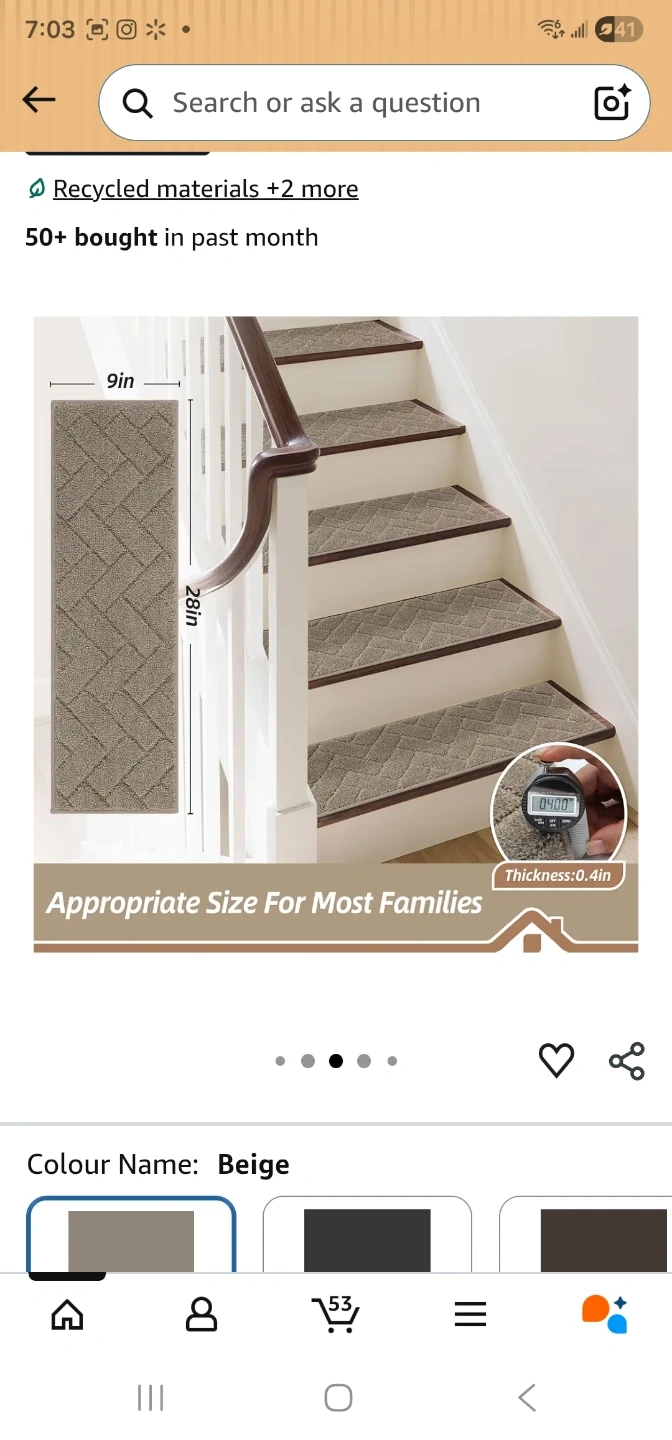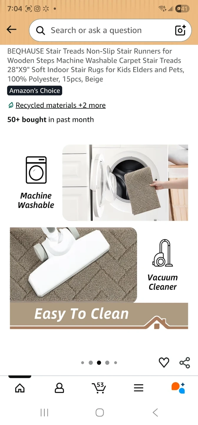 BEQHAUSE stair treads with non-slip backing are made from 100% polyester. They're machine washable and come in a beige colour. Each tread measures 28"x9" with a thickness of 0.4".