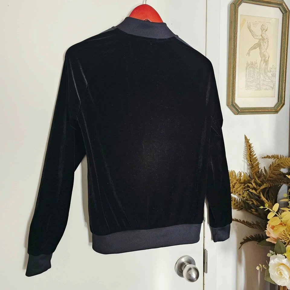 Jacket has 2 zippered pockets and closes with a full length front zipper. Made with a super soft and stretchy velvet-like fabric. Both pieces have an embroidered trefoil logo. The cuffs, waistband and collar of the jacket are made of a ribbed fabric that doesn't pill.