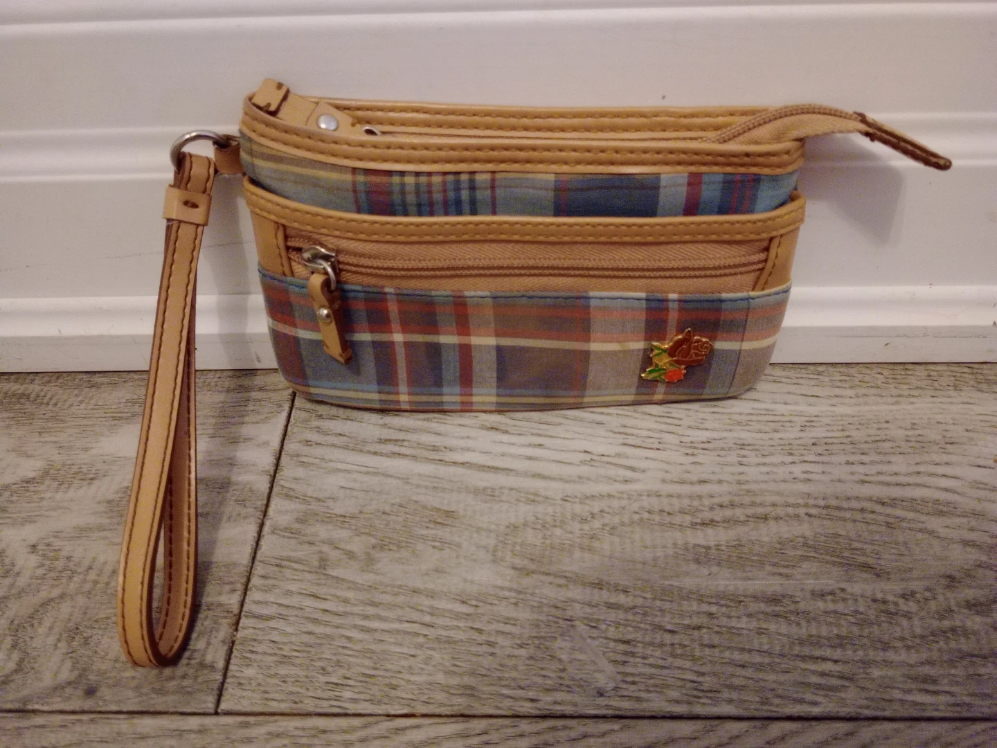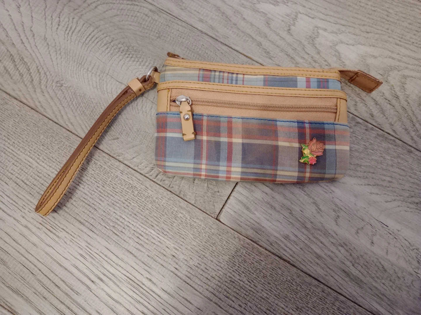 Check out this charming Tommy Hilfiger wallet! It features a cute plaid design with a floral accent. Perfect for keeping your essentials organized with its zippered compartments and convenient wrist strap.