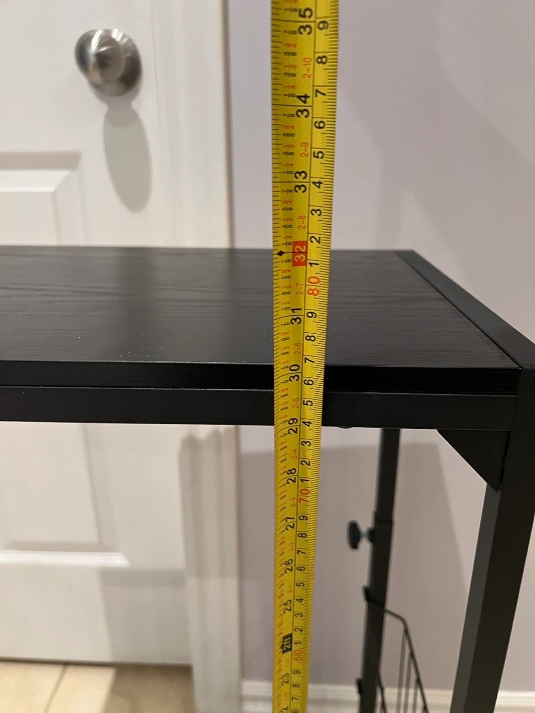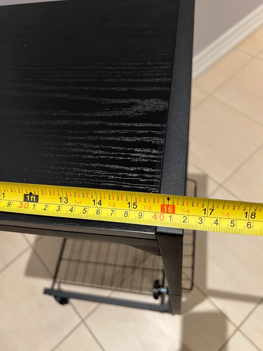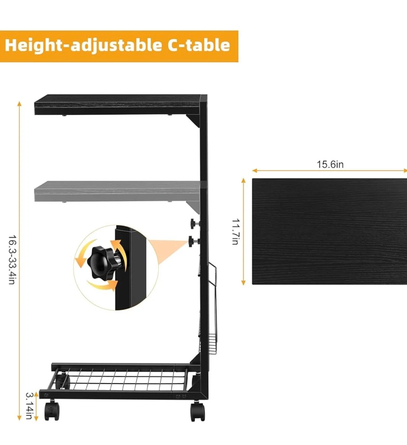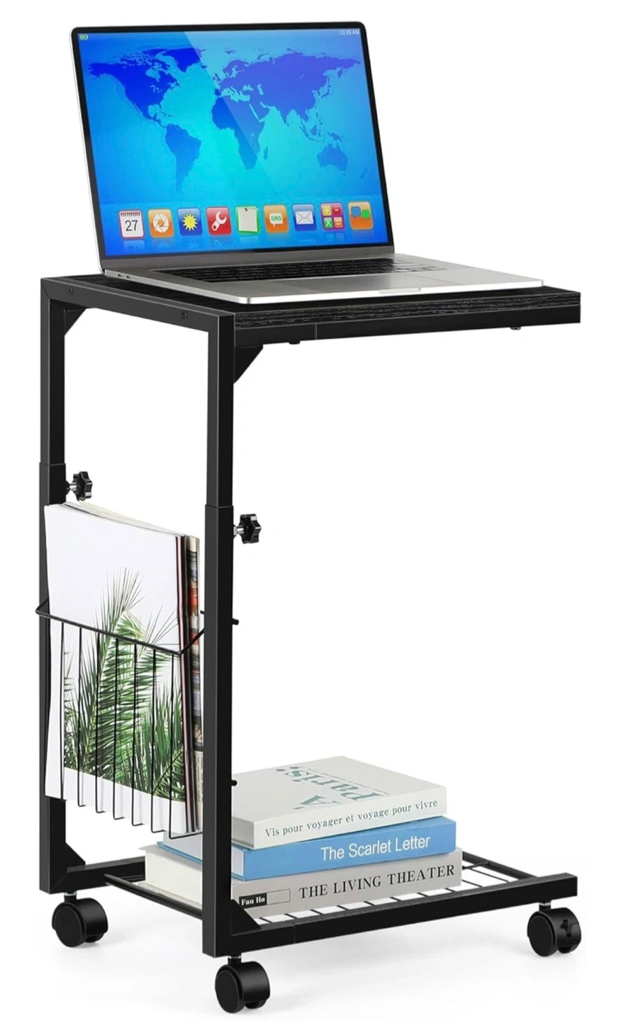 This is a black rolling side table with a convenient magazine rack. It's made with a durable black metal frame and a wood-look top. The table measures approximately 32 inches in height. It features wheels for easy mobility.
