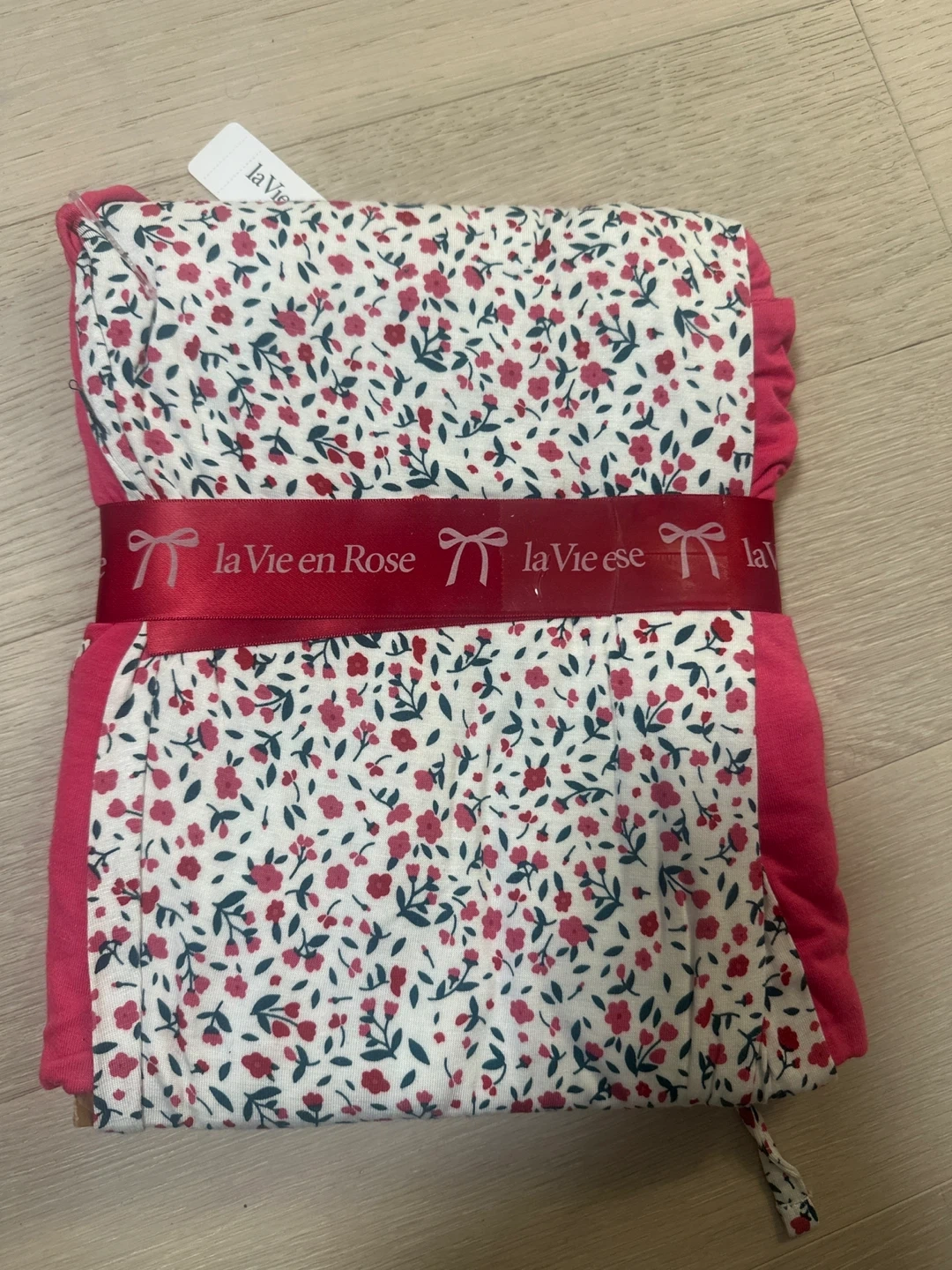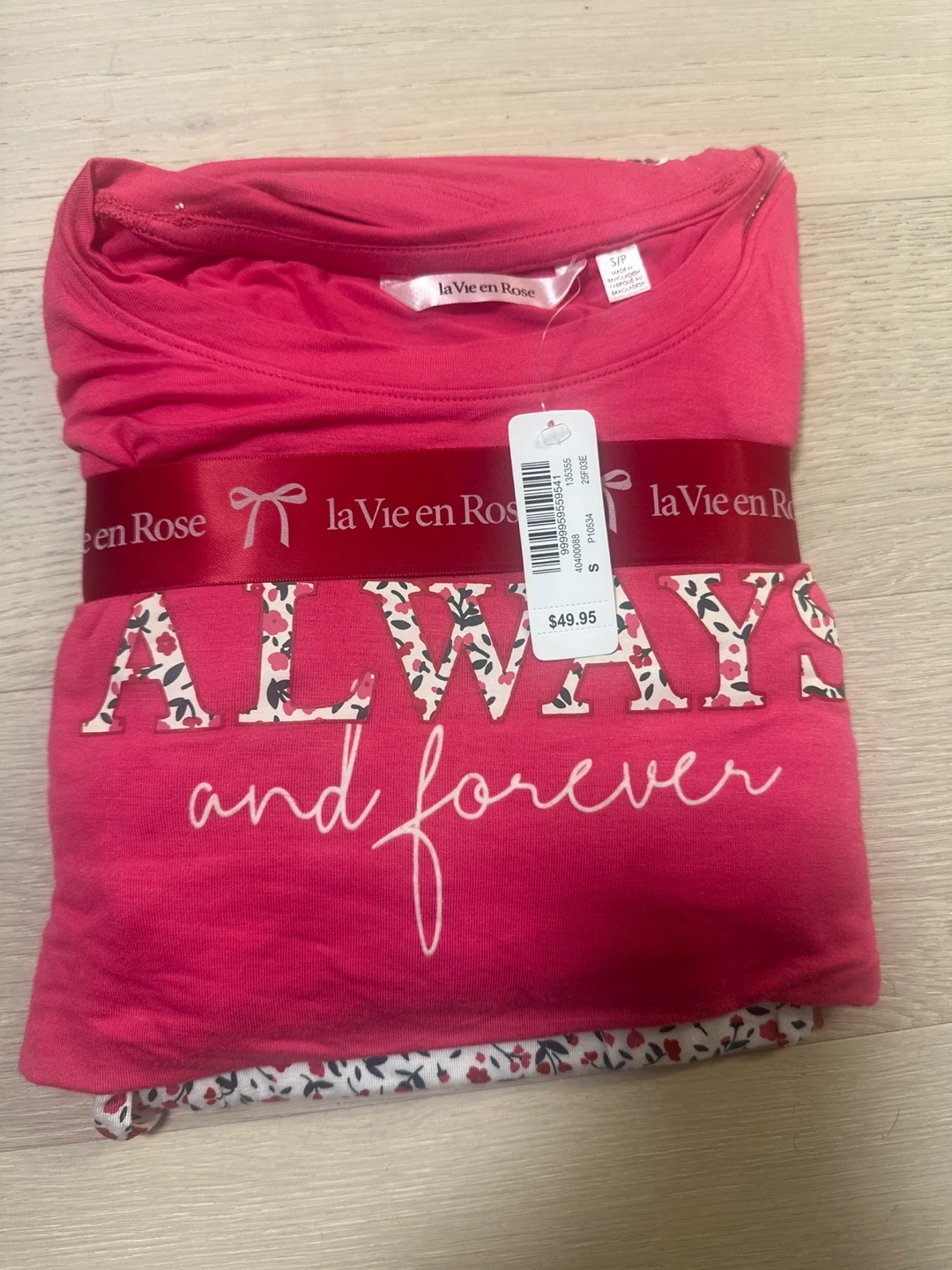 This is a La Vie en Rose sleep set in size S/P. It includes a pink top with "Always and forever" printed on it, and floral print bottoms. The fabric feels soft and comfortable, perfect for lounging or sleeping.