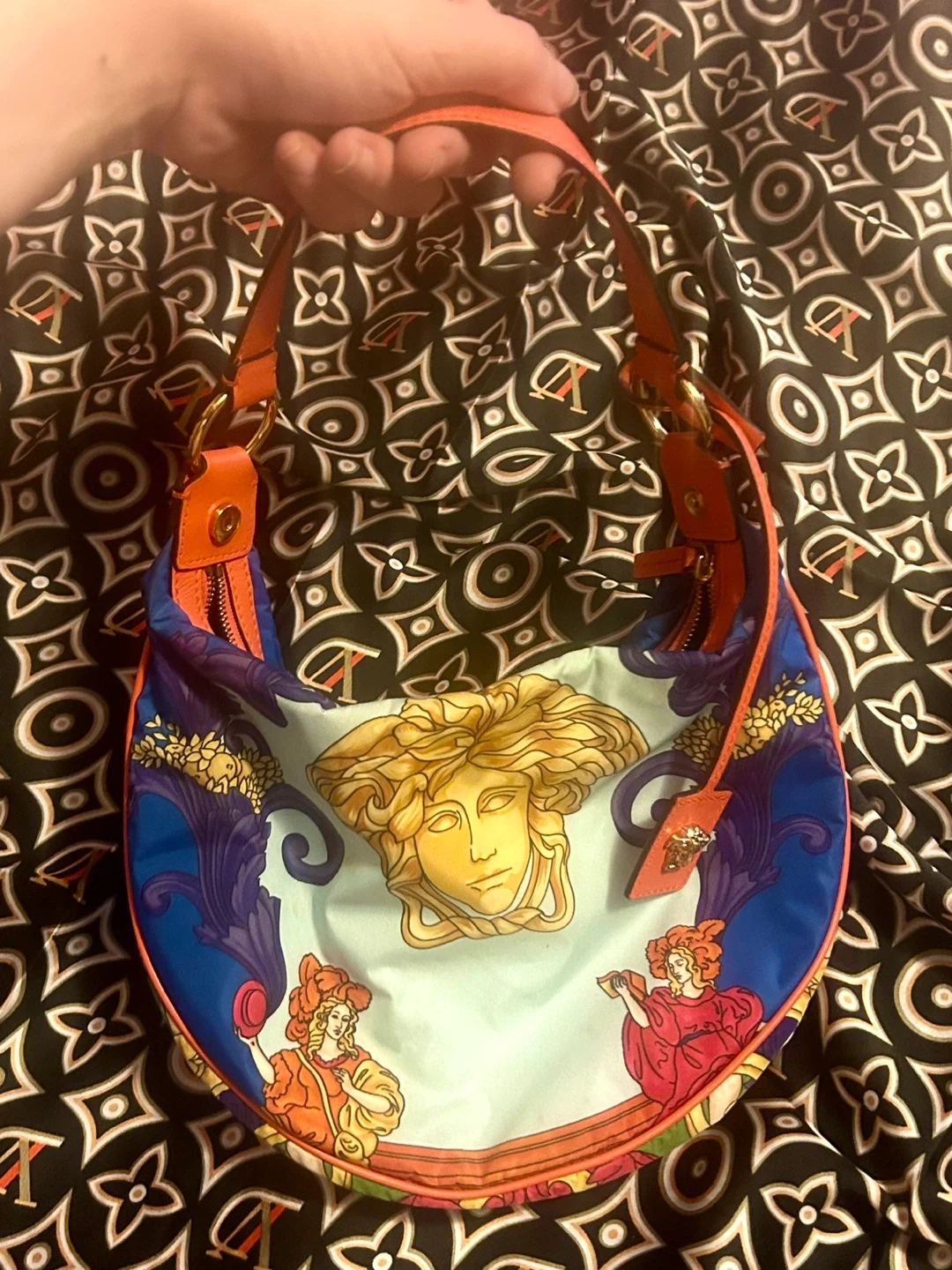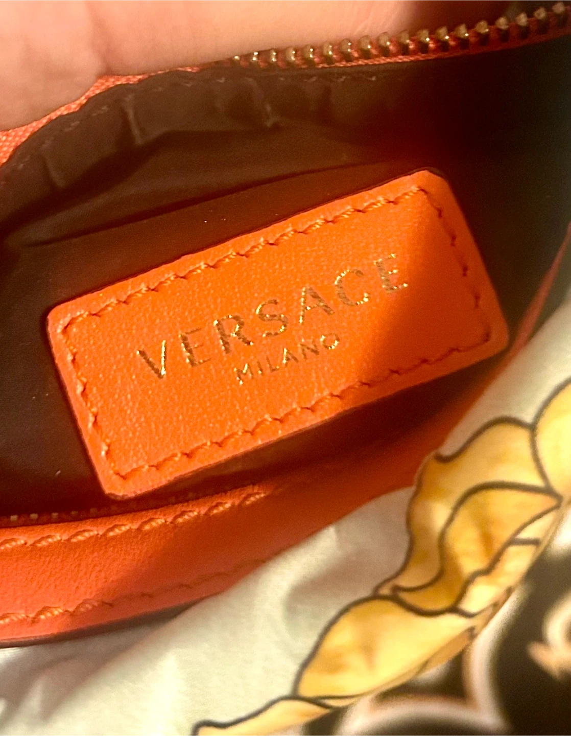 • Top golden zipper opens to a black nylon interior with orange leather Versace tag