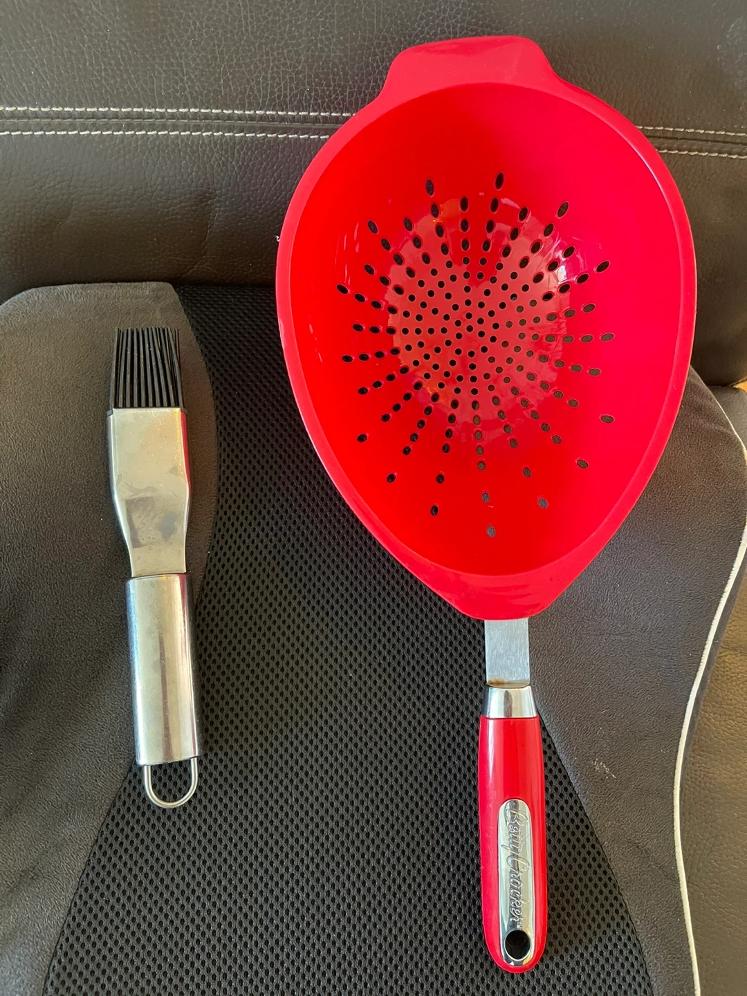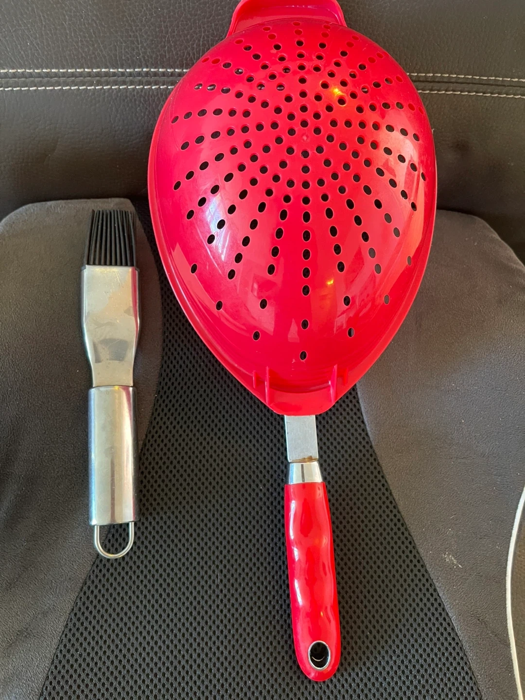 A red plastic colander with a handle and a metal basting brush with silicone bristles. The colander is great for draining pasta or washing vegetables. The brush is handy for applying sauces or marinades.