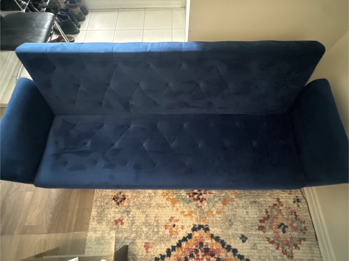 Stylish blue velvet sofa bed. It features a tufted design and rests on elegant gold-toned legs. Folds out for extra sleeping space. No pet no smoking no kids used very good condition. I bought only six months moving sale.