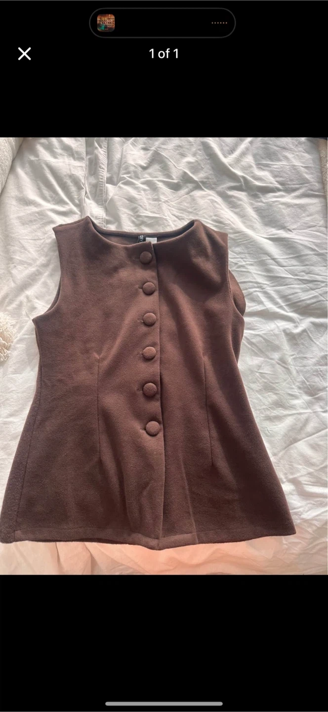 Here's a cute H&M brown sleeveless top! It features a button-down design, perfect for layering or wearing on its own. It's in great condition and ready for a new home in your wardrobe