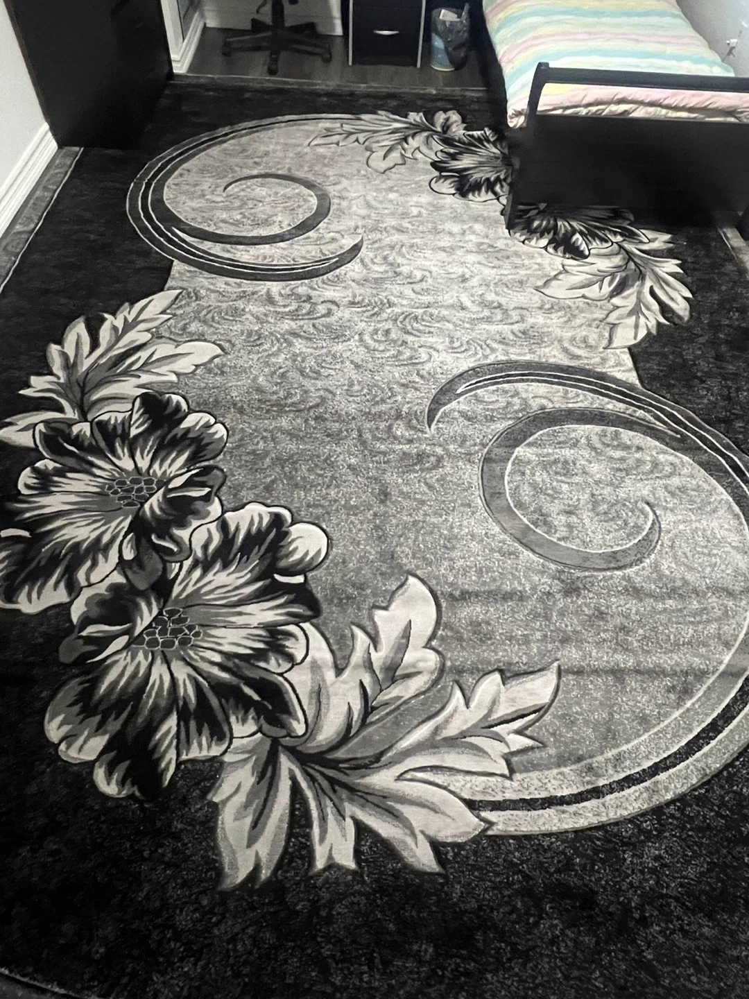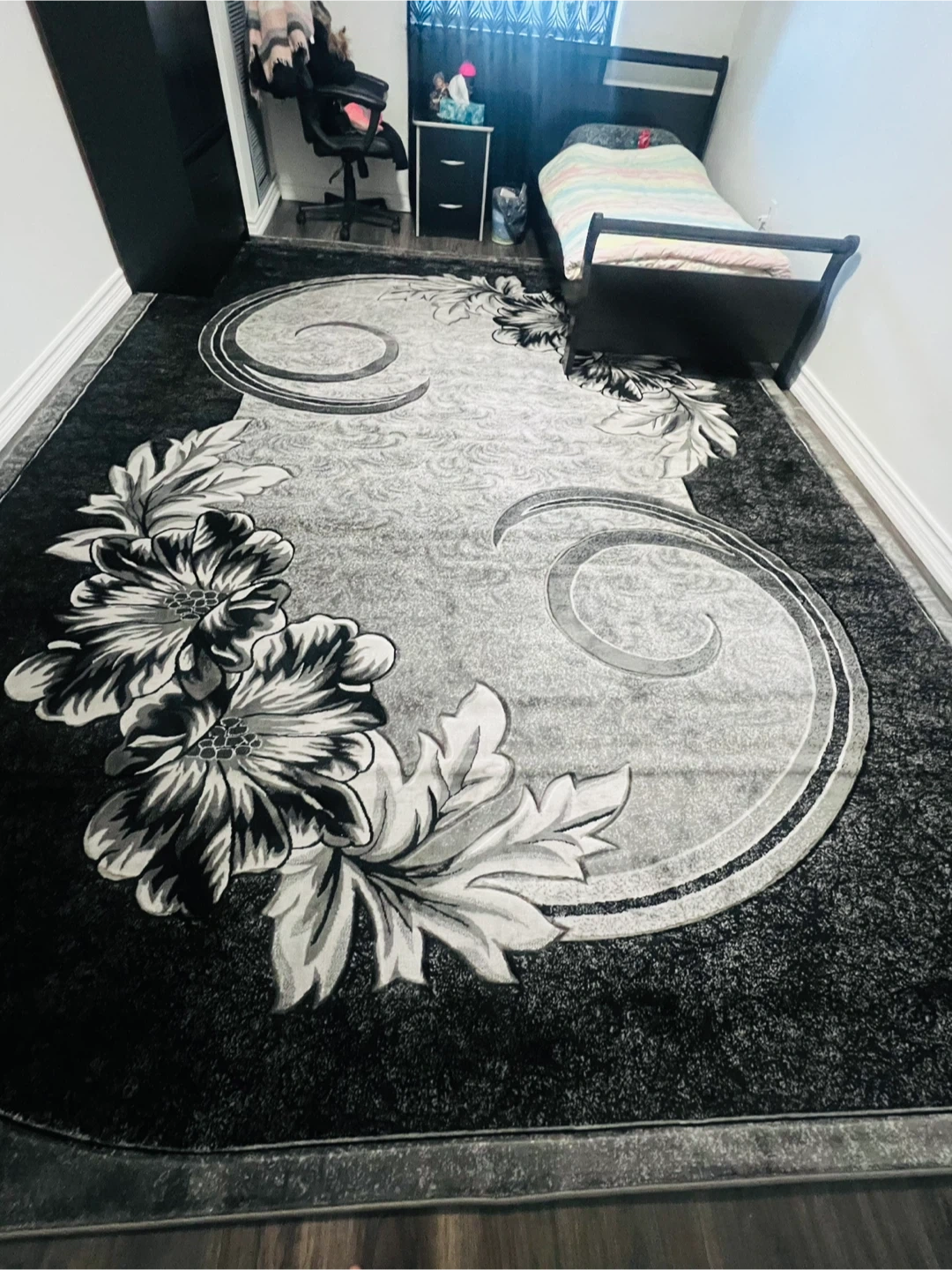 This is a large area rug featuring a detailed floral and scroll pattern. It's primarily black and grey, offering a sophisticated look. The rug's texture is soft and inviting. Brand new rug just got it today March 1, 2026. Selling because a little over sized for my room.
