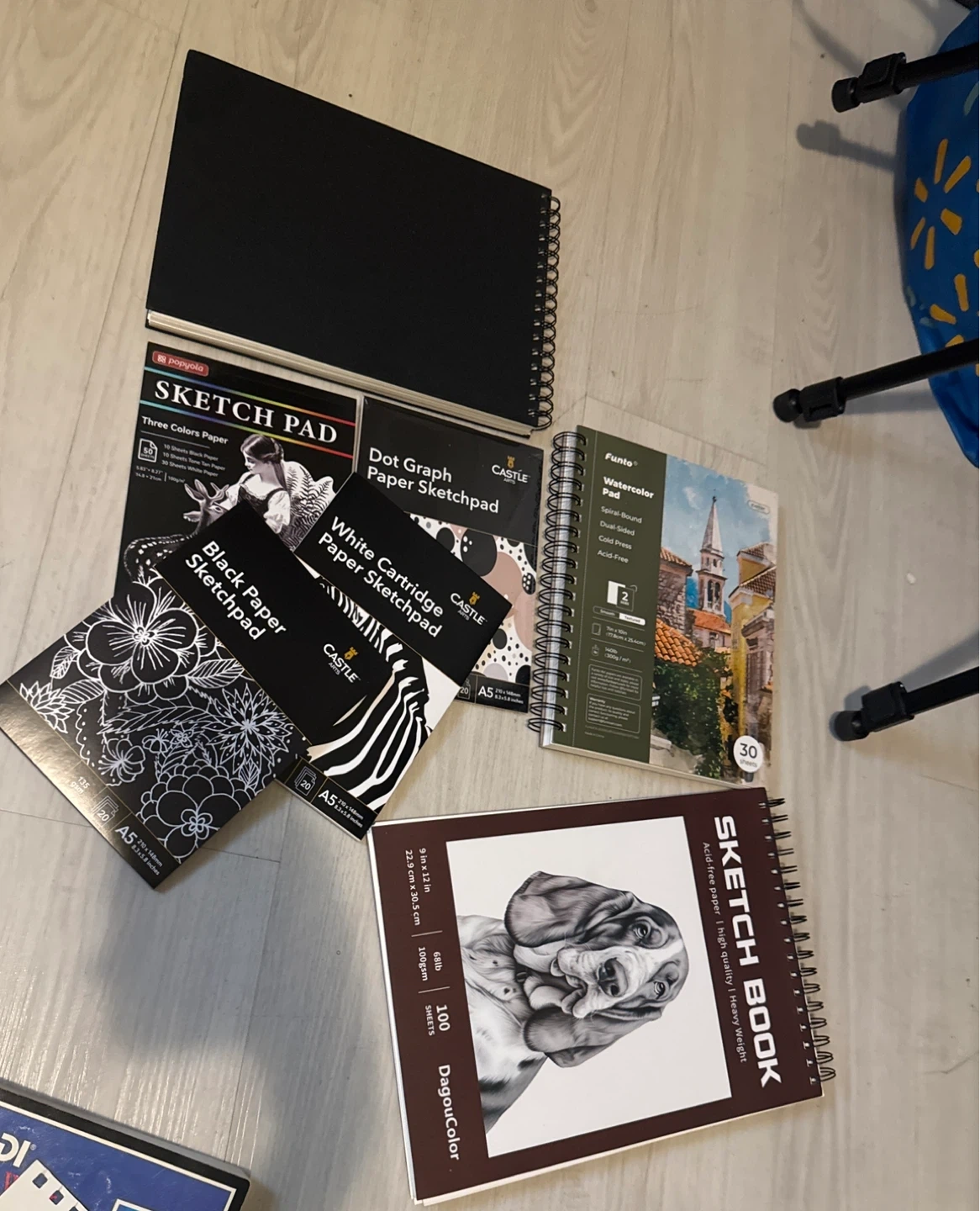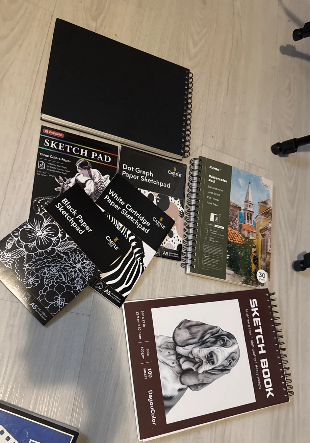 Selling a collection of sketch pads and sketchbooks including brands like Castle Arts, Popyola, and DagouColor. There's a variety of paper types including white cartridge paper, black paper, and dot graph paper sketchpads. One of the sketchbooks has acid-free paper and is high quality and heavyweight. The Popyola sketch pad has three colors paper.