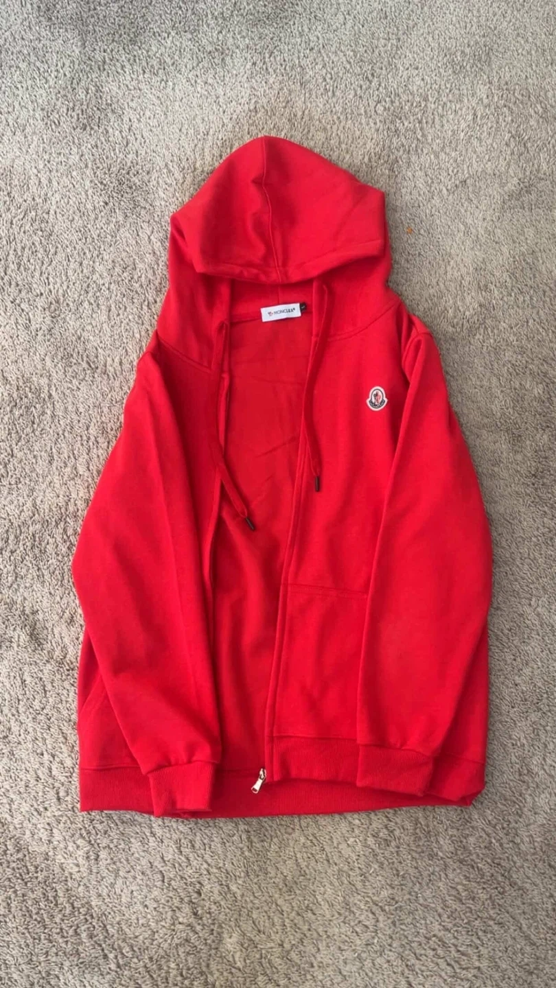 This is a red Moncler zip-up hoodie with a hood. It's a size large. Features the classic Moncler logo patch on the chest. It's perfect for cooler weather!