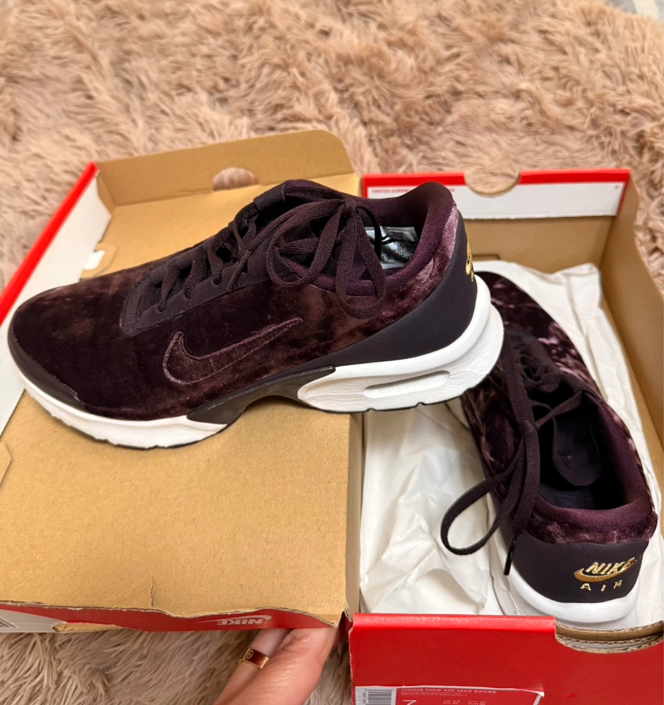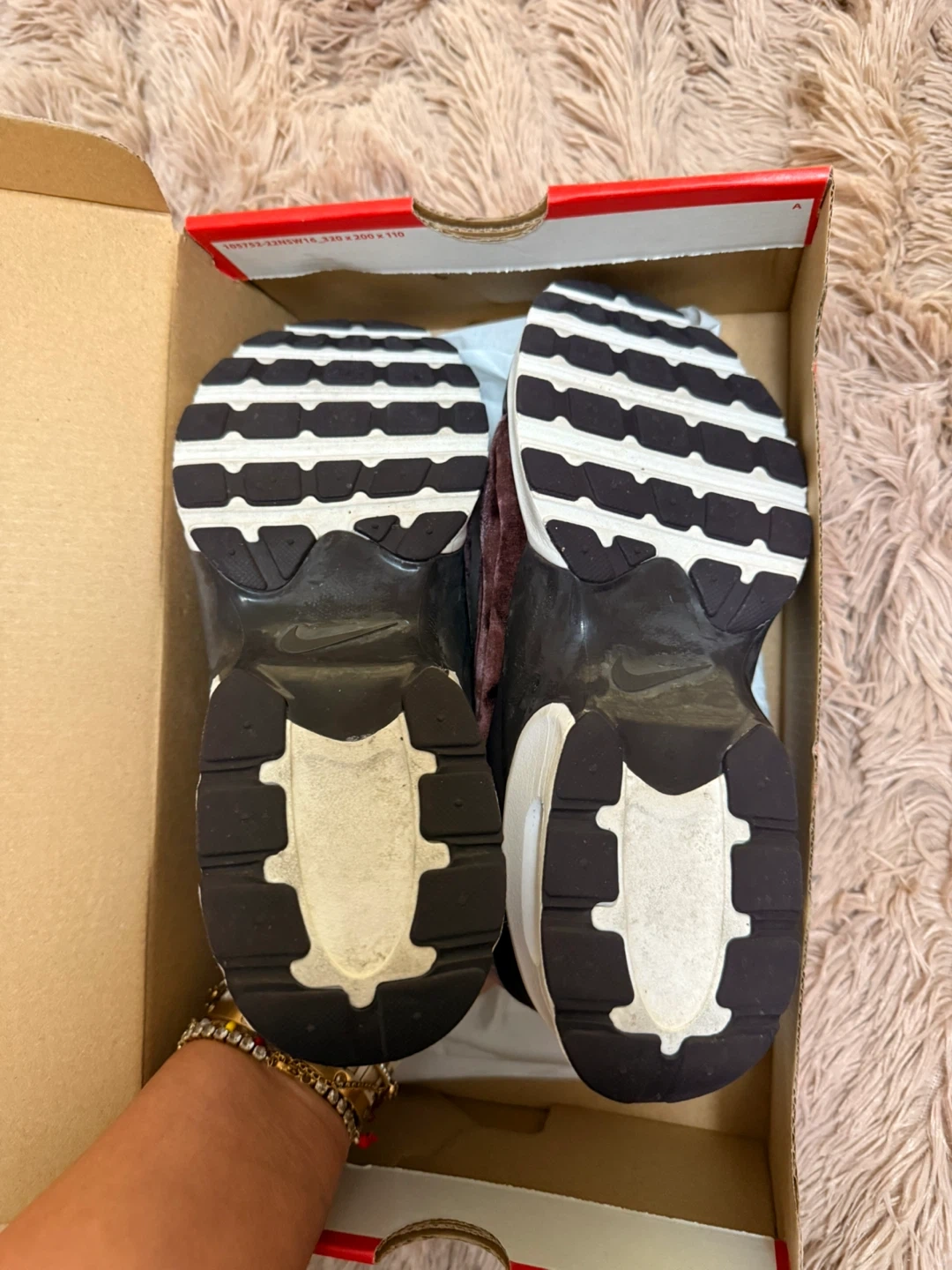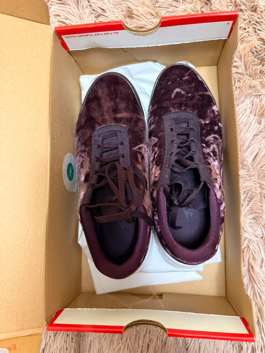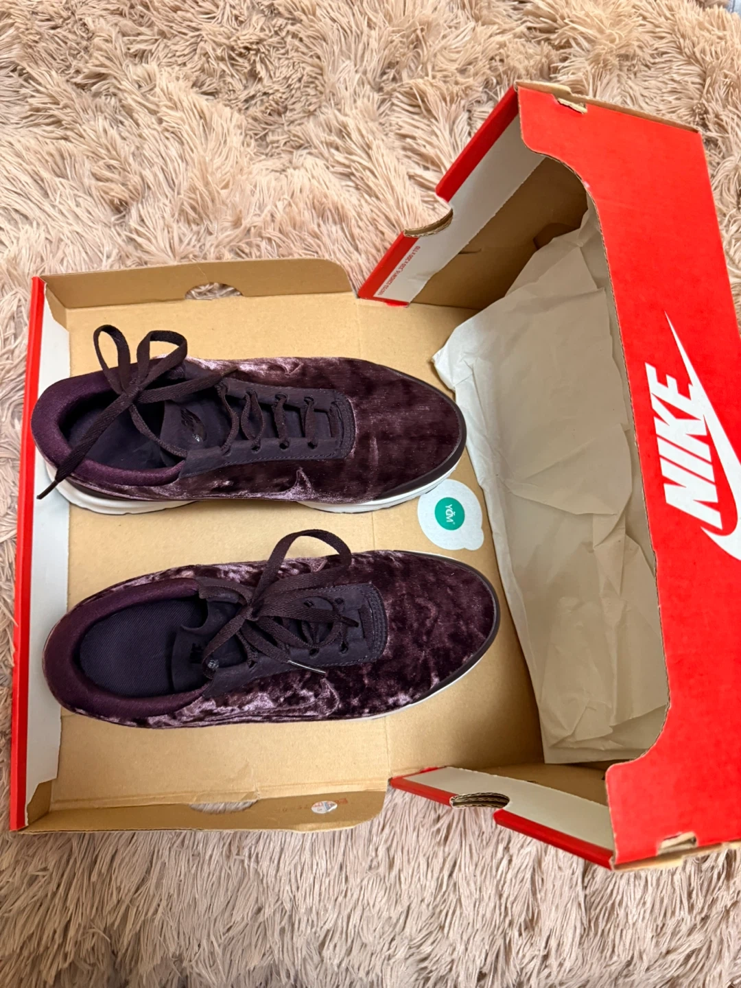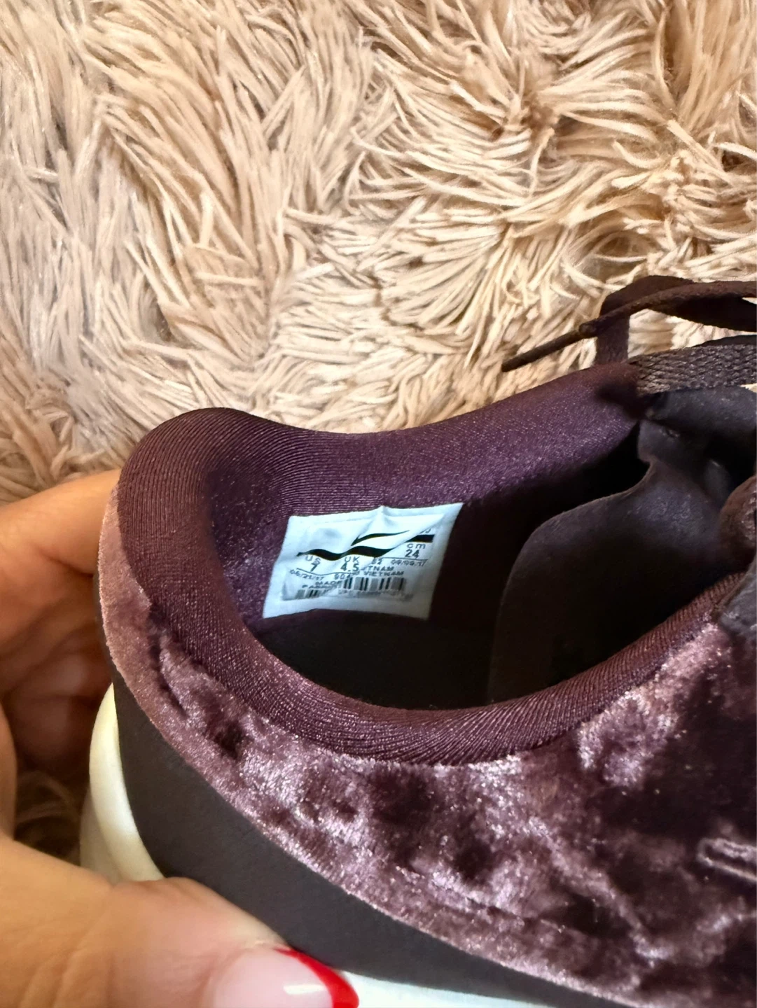 Nike Air sneakers in a rich burgundy velvet material. Comes with the original box. These shoes are size 7 and offer a stylish look and comfortable fit.