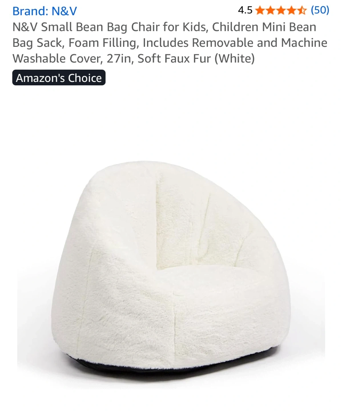 Snuggle up in this cozy N&V small bean bag chair! It's perfect for kids and features a soft faux fur cover. The cover is removable and machine washable, making it easy to keep clean. It measures approximately 23.5" tall, 30" wide, and 31" deep. Originally bought for $75.99.