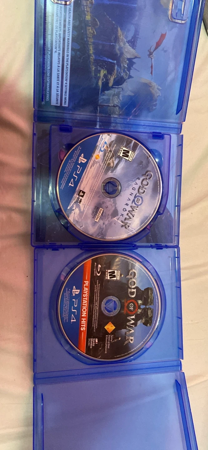 Two PlayStation 4 games included: God of War and God of War Ragnarok. Both discs are in good condition. I had a blast playing these games, very good story and very fun to hop on after a long day. Good puzzles and game play