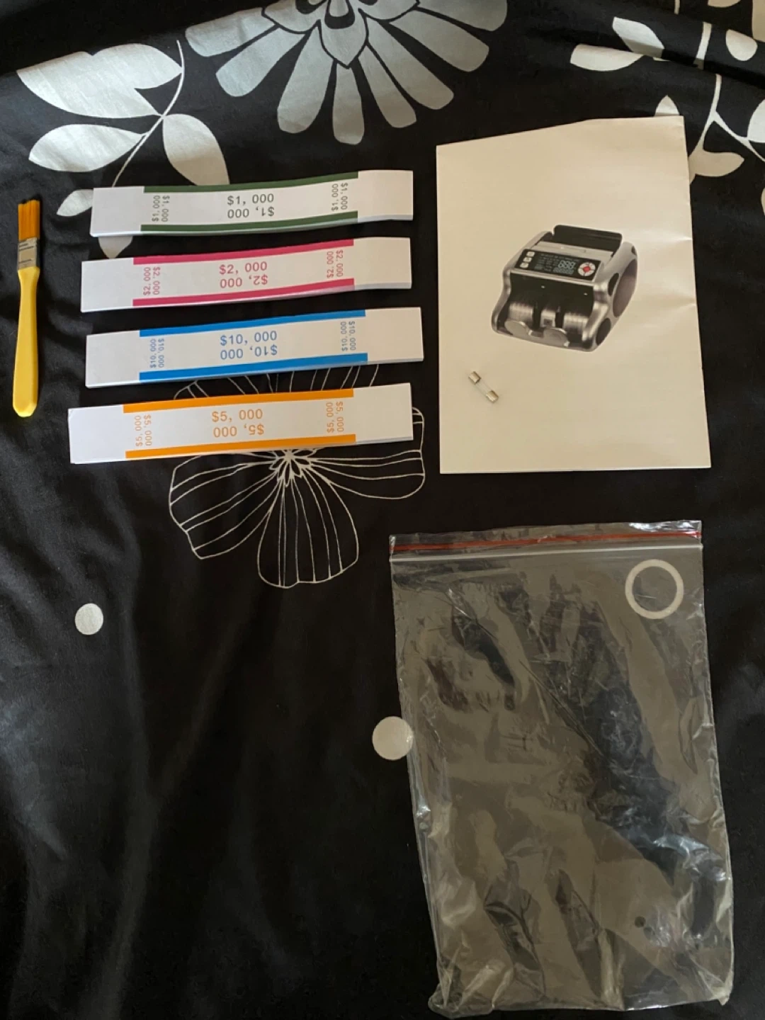 This is a bill counting machine. It's silver and comes with a brush and several stacks of play money in different denominations. It's great for practicing counting large sums or for use in games. Comes with the machine, brush, and fake money bills.
