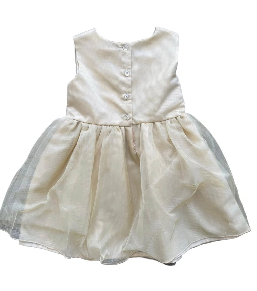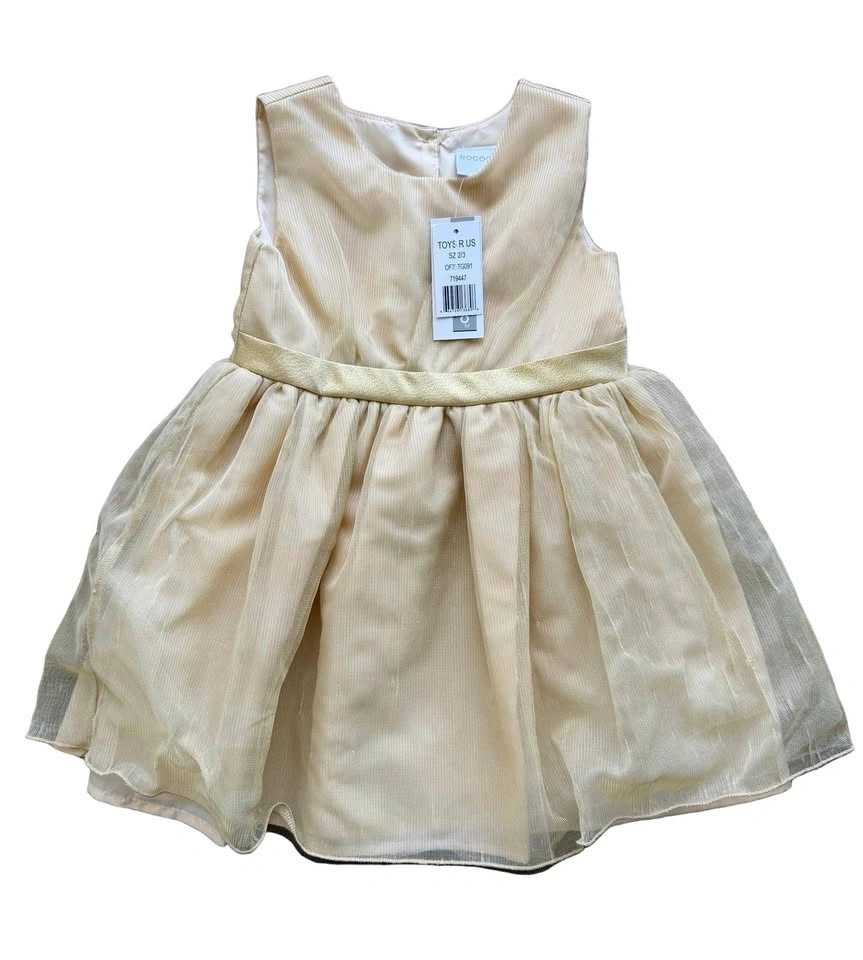New with tags Rococo toddler dress. Shimmery gold dress has a sleeveless top with a full skirt. Size 2/3. Buttons up the back.