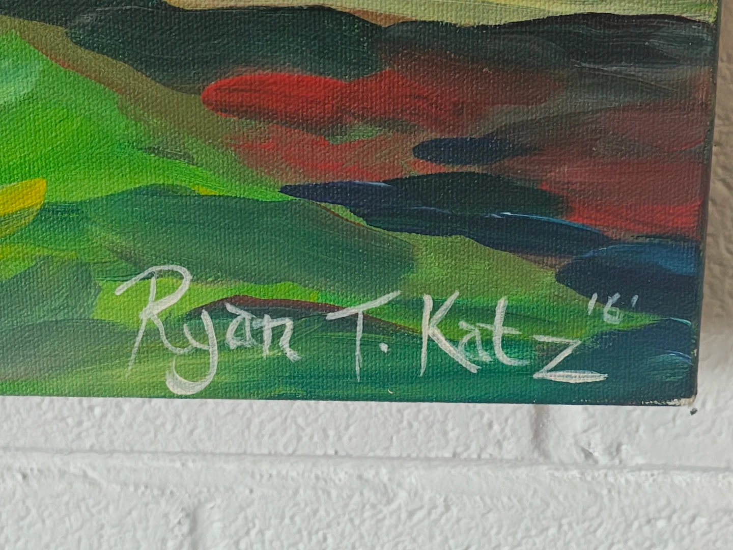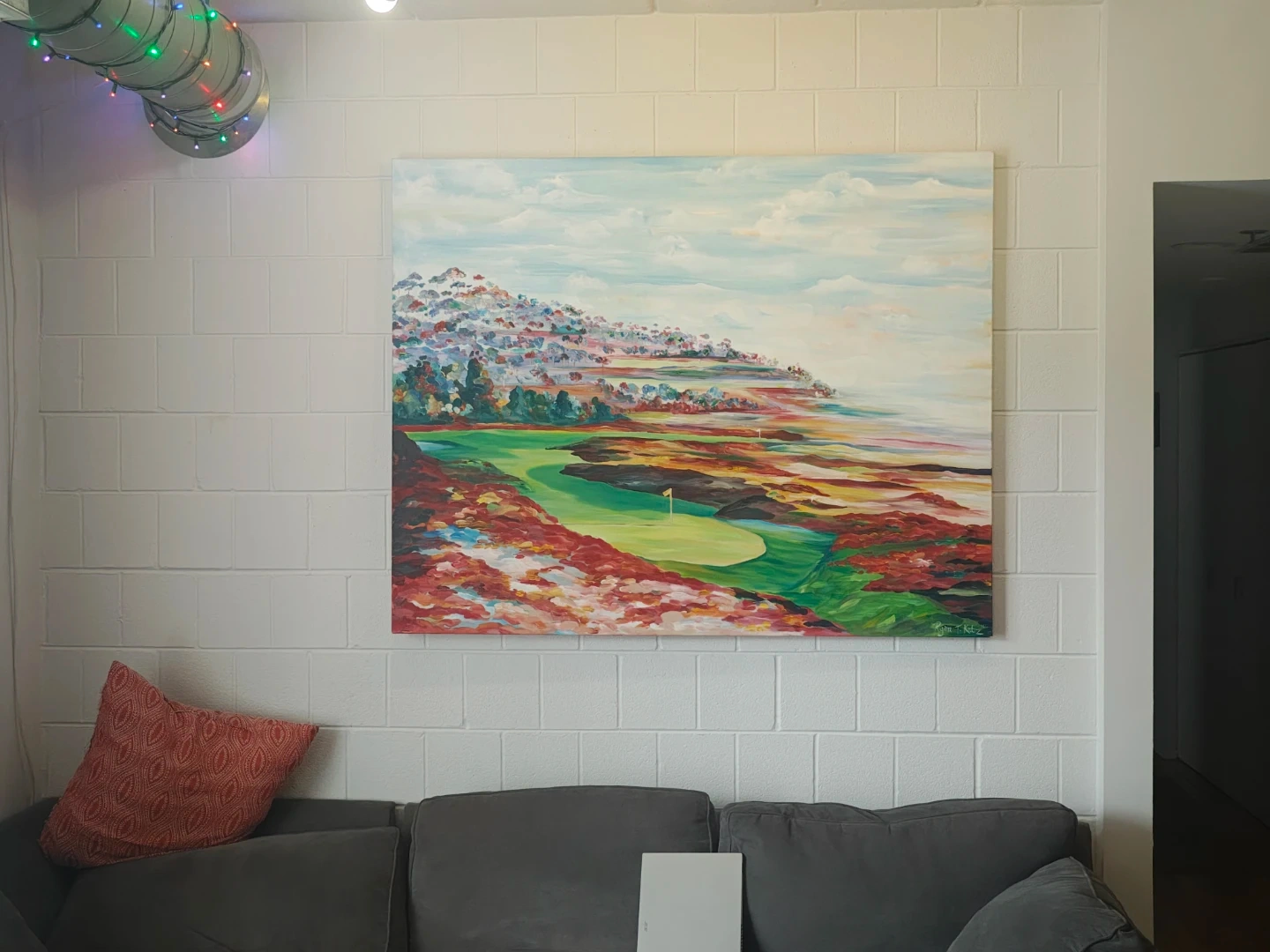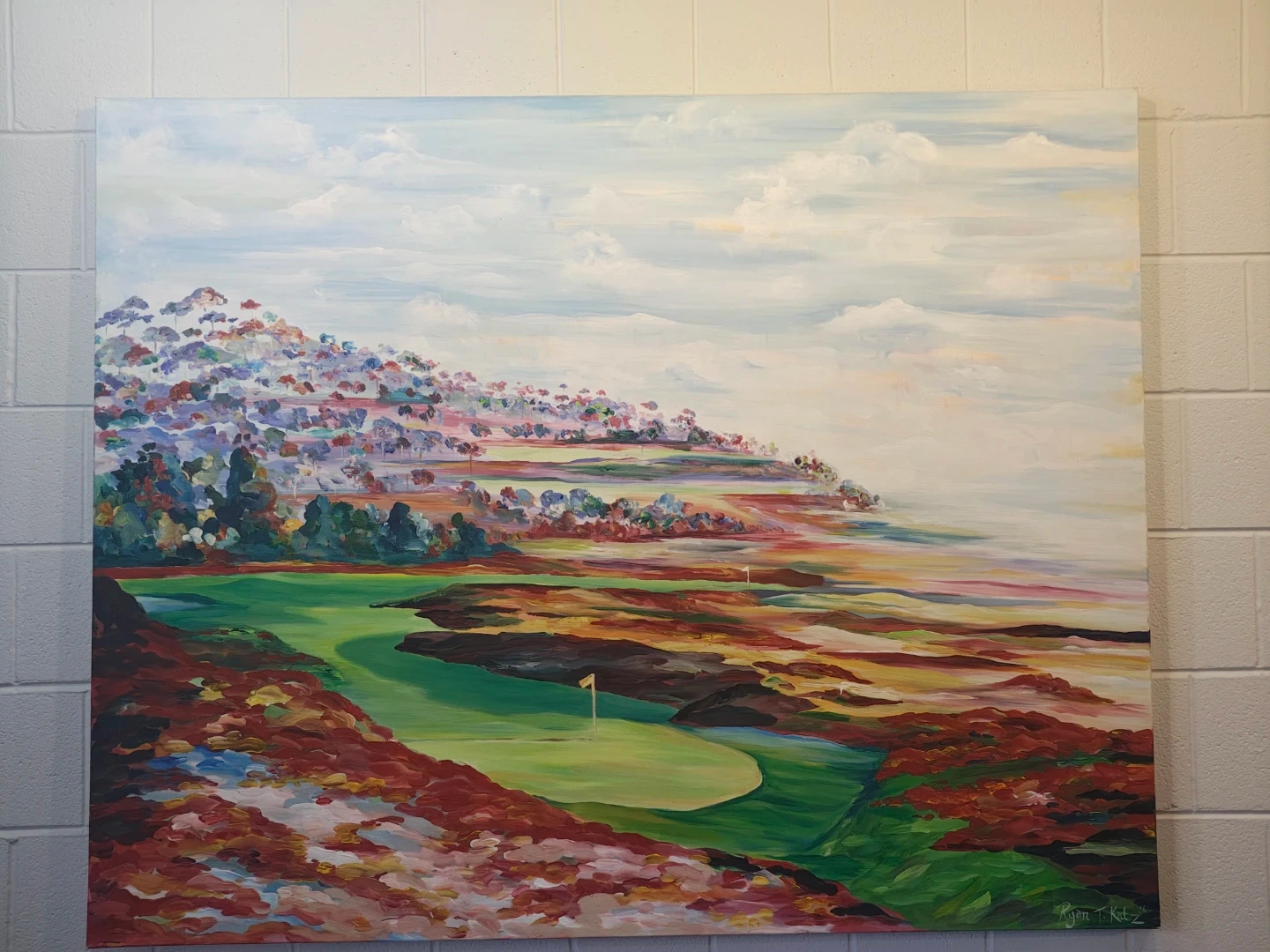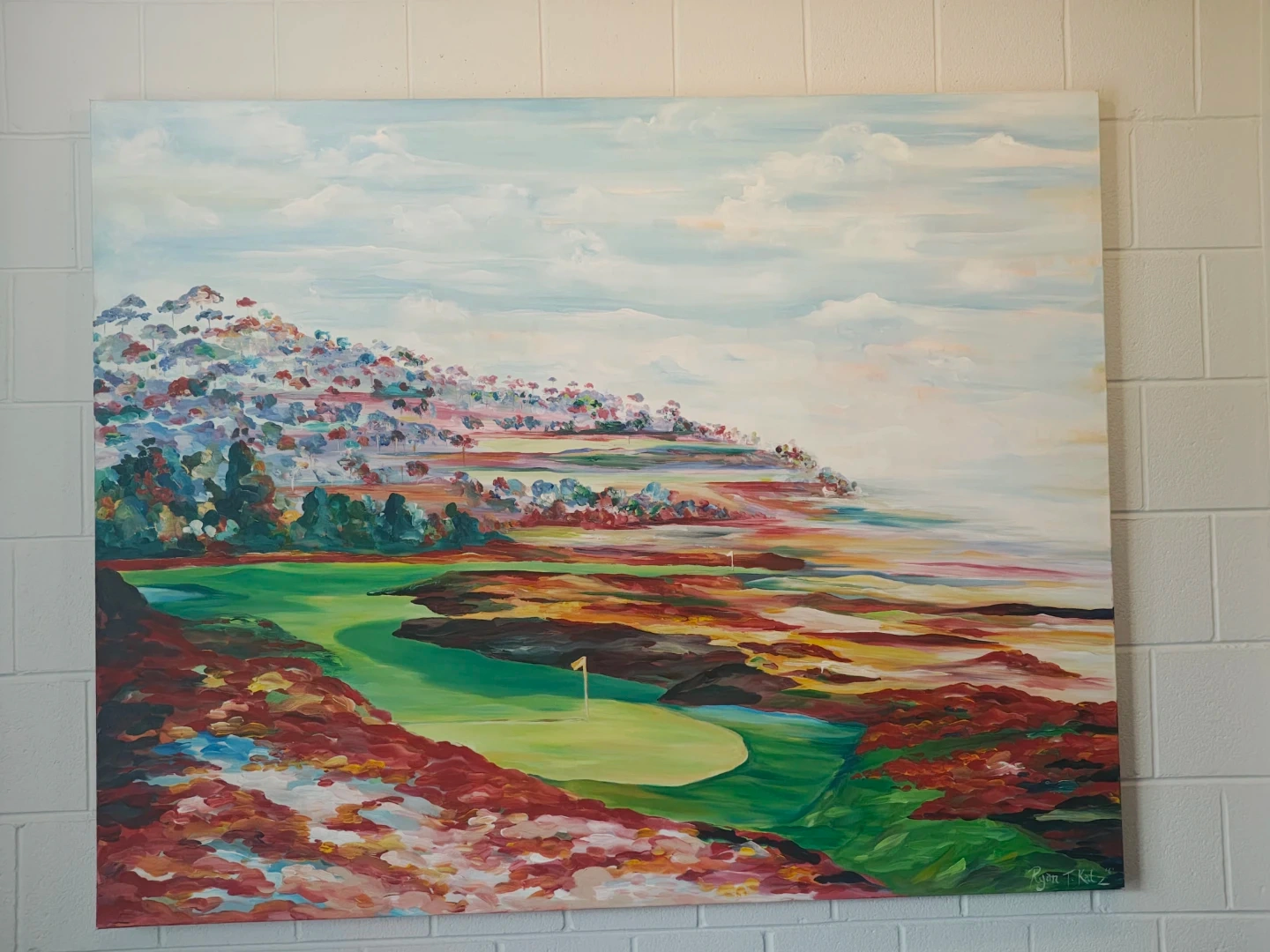 Large original painting of a vibrant golf course landscape. By Ryan T. Katz(The Readers street artist of the Year) It's a beautiful, colorful depiction of a golf hole with a flag. This artwork would be a great addition to any golf enthusiast's home!