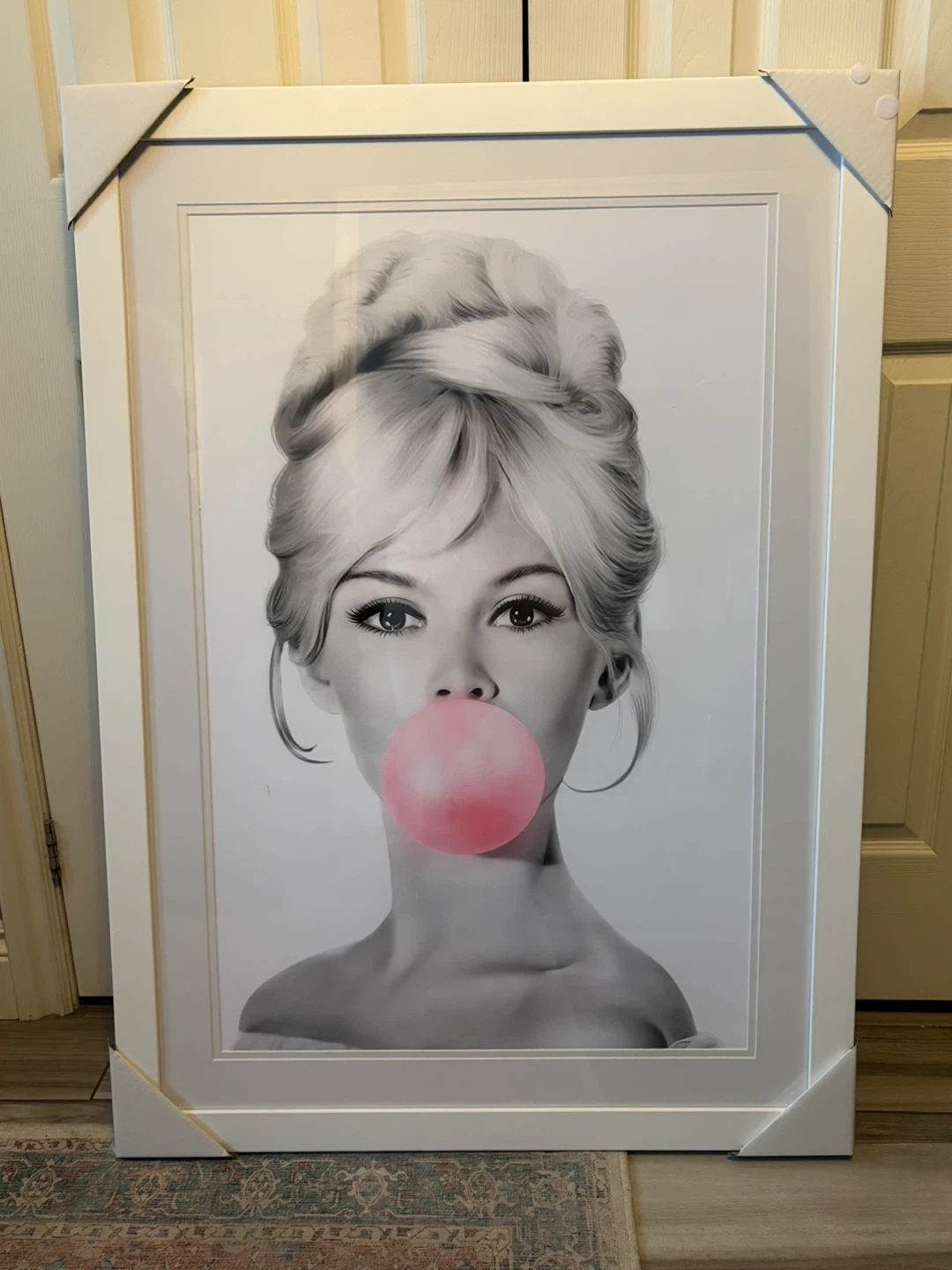 Framed black and white art print of a woman blowing a pink bubble gum. The frame is white and comes with protective corner guards. It's a stylish piece for any room!
