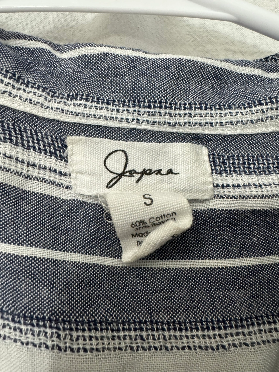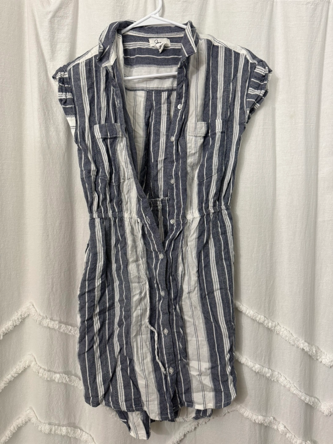Cute mini dress. Blue and white vertical stripes. Button-down closure. Cinched waist. Short sleeves. Size small.