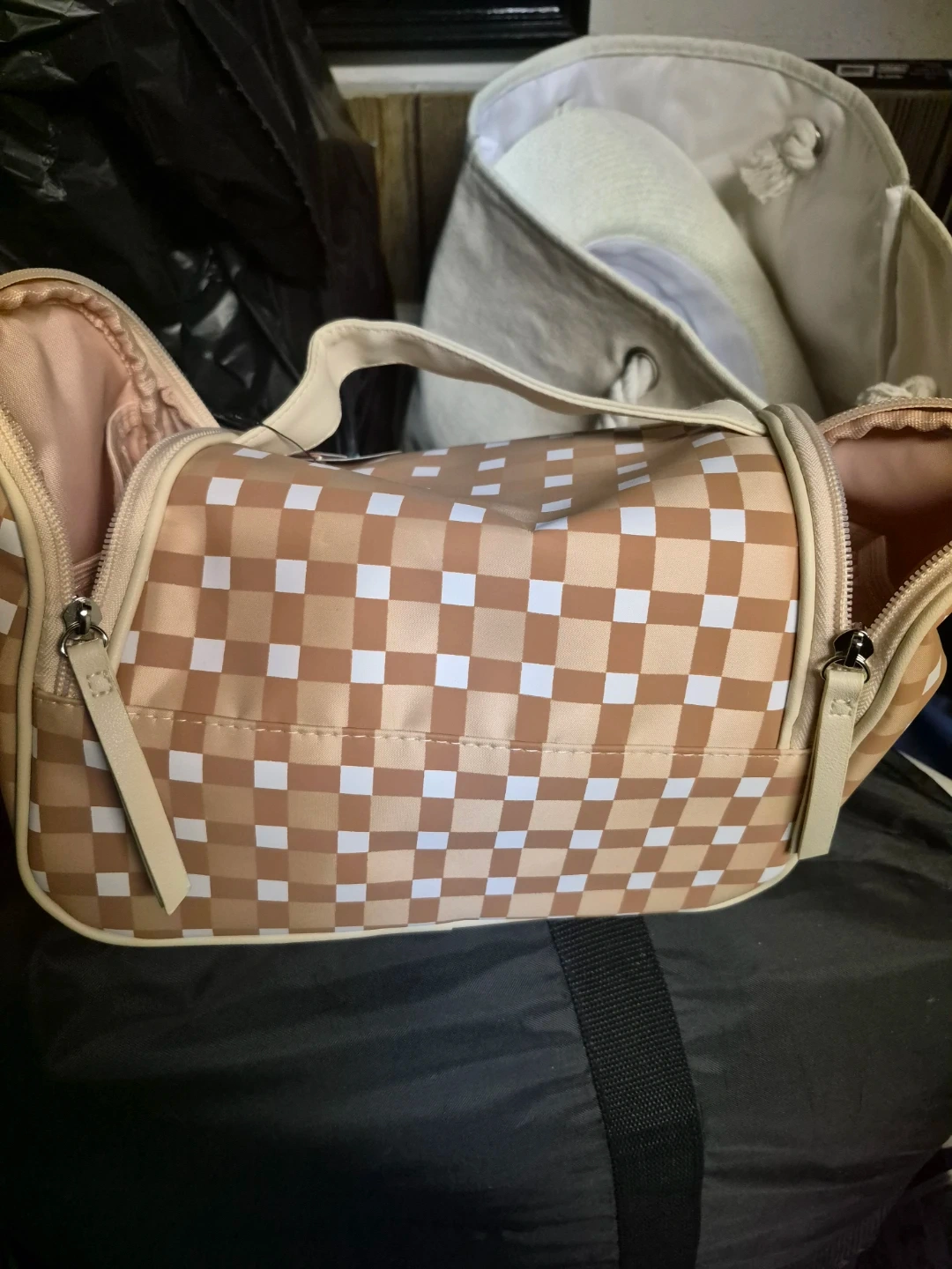 This Tender Love + Carry cosmetic bag has a checkered pattern. It's perfect for storing makeup and toiletries. Includes multiple compartments inside for organization.