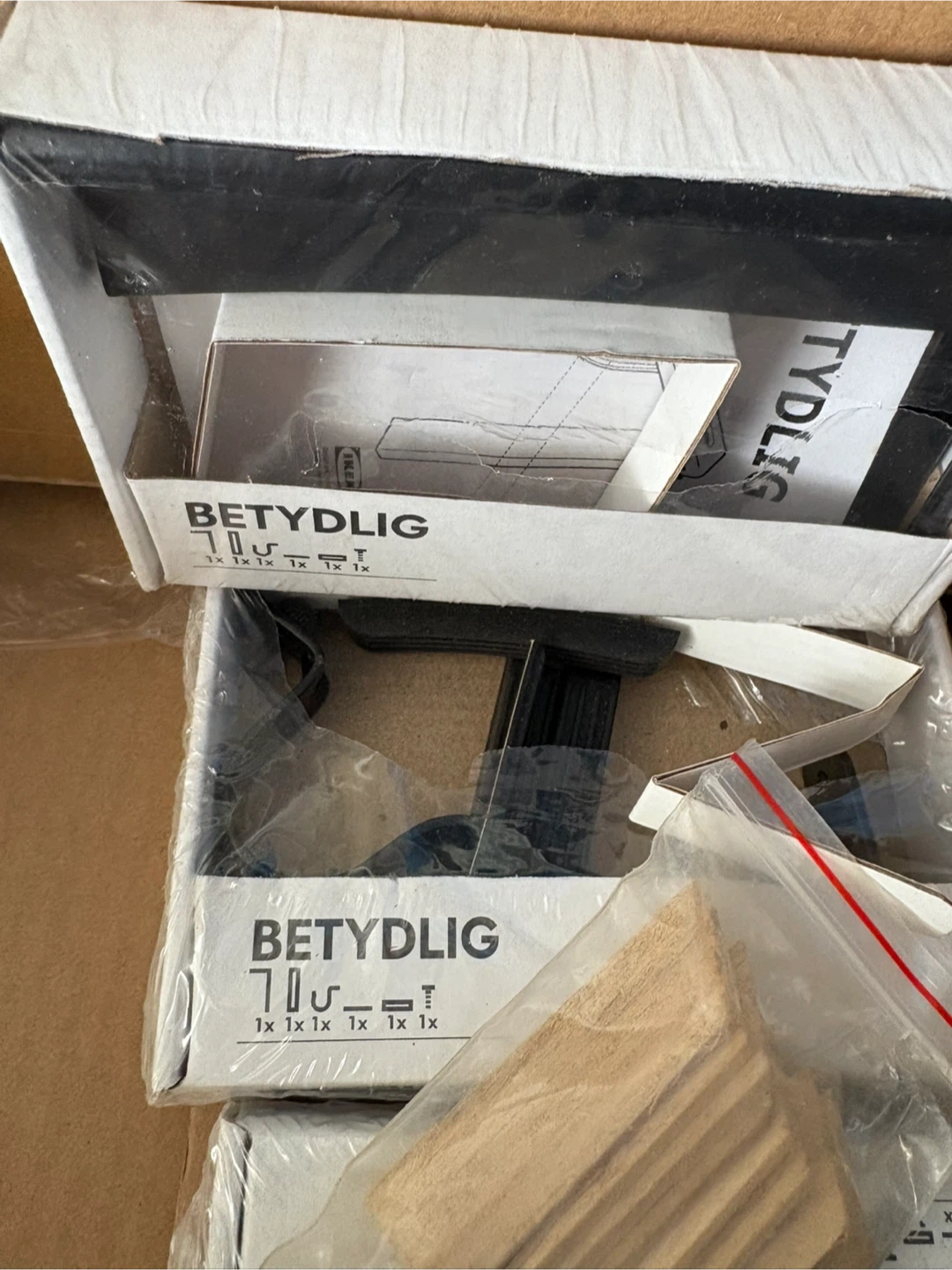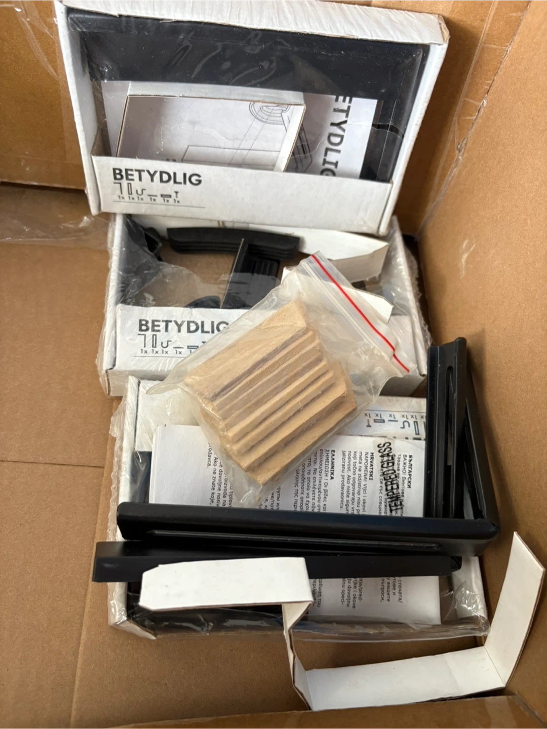 This is a set of four IKEA BETYDLIG picture frame hangers in black. They're designed for hanging frames securely. Includes all necessary hardware for installation.