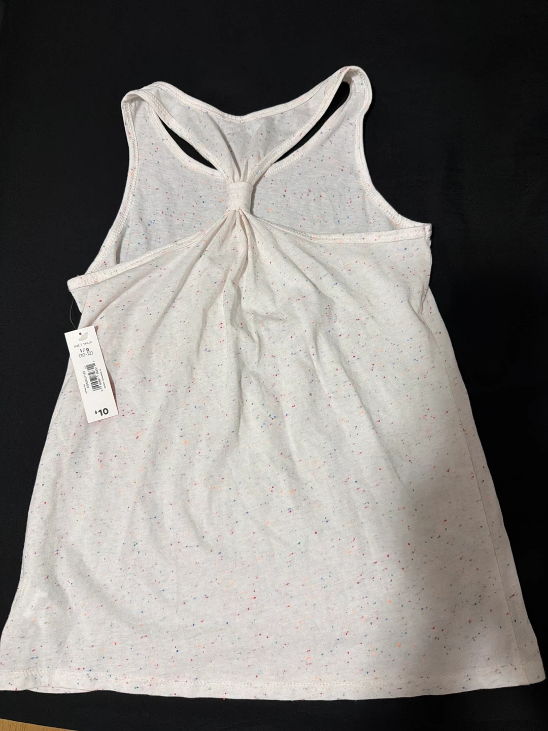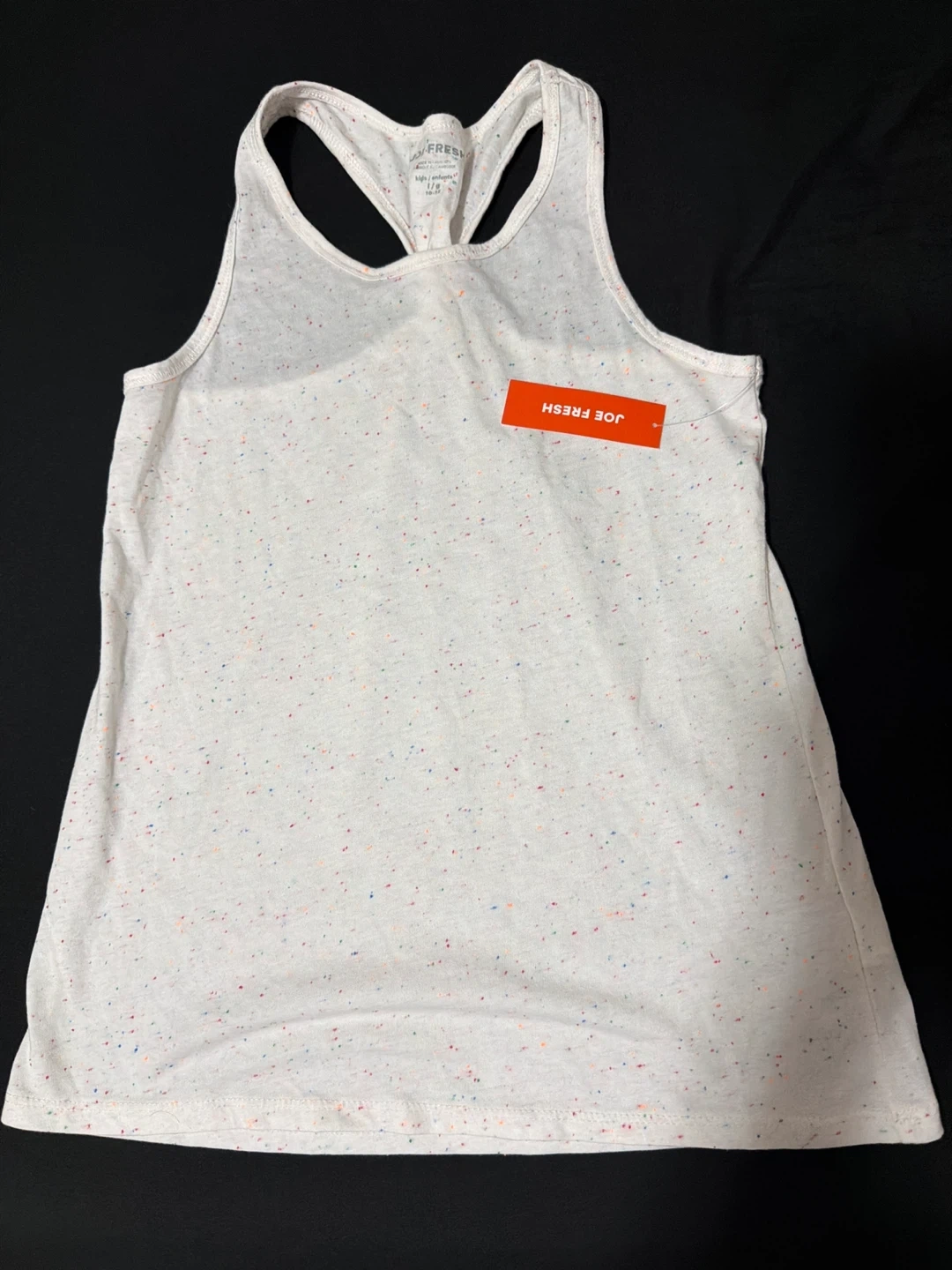 This Joe Fresh tank top is white with a fun multicoloured speckle pattern. It's size large, fitting kids' sizes 10-12. Made with a comfortable fabric blend.