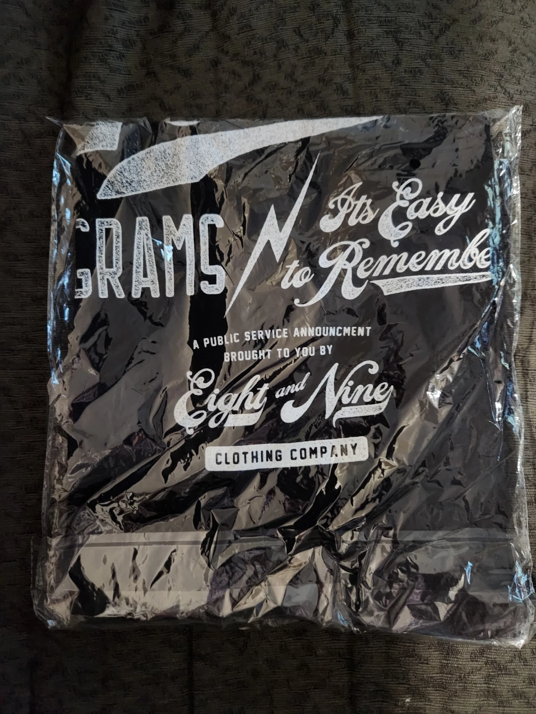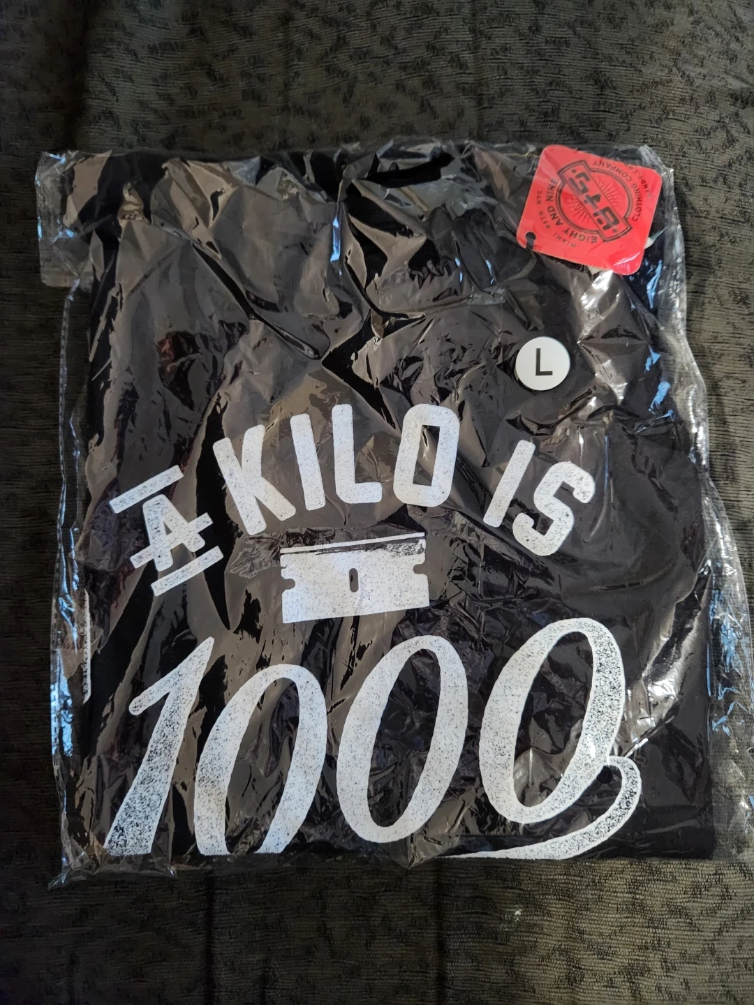 This is a black t-shirt from EIGHT and NINE CLOTHING COMPANY. It features the "1 KILO IS 1000 GRAMS" graphic. It's a size large. The shirt is still in its original packaging.
