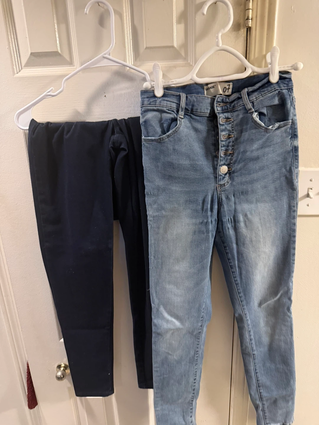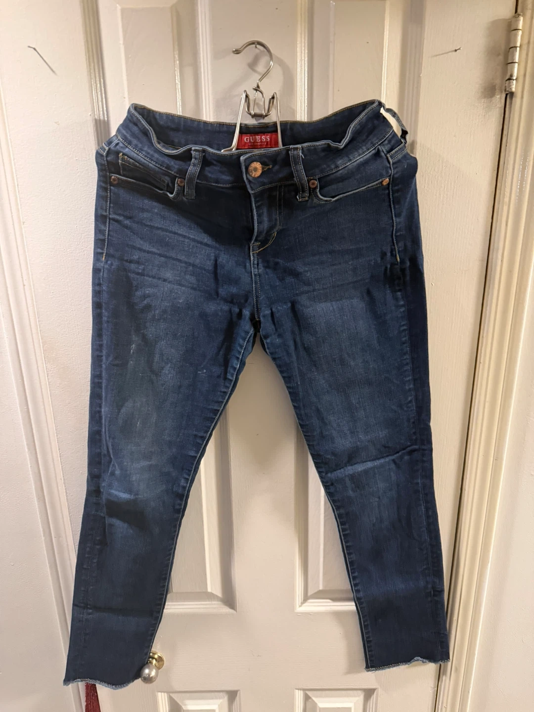 This lot includes seven pairs of women's pants and jeans. Brands visible include Guess and Garage. Various styles and colours are present. They're all pre-owned. These pants are suitable for everyday wear.