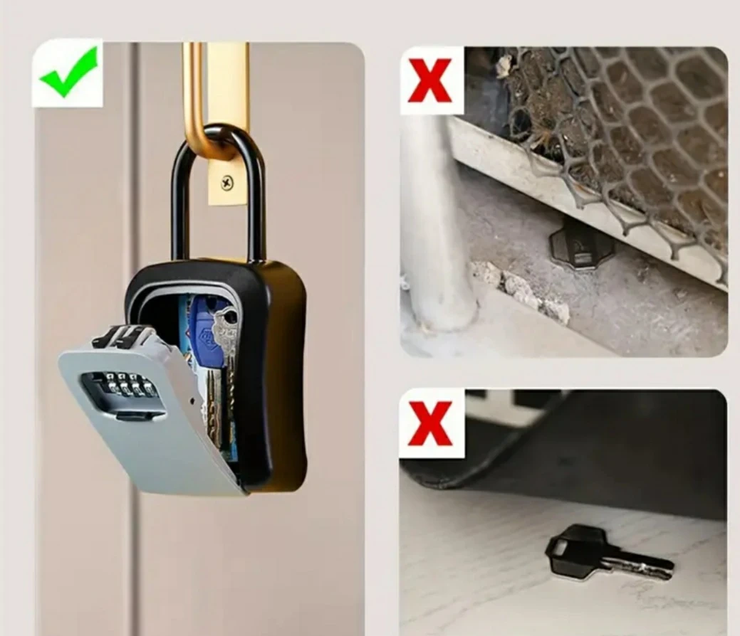 This is a secure key storage lock box with a 4-digit combination lock. It's designed for convenient and safe key access when you're not around. The durable construction offers reliable protection for your spare keys.