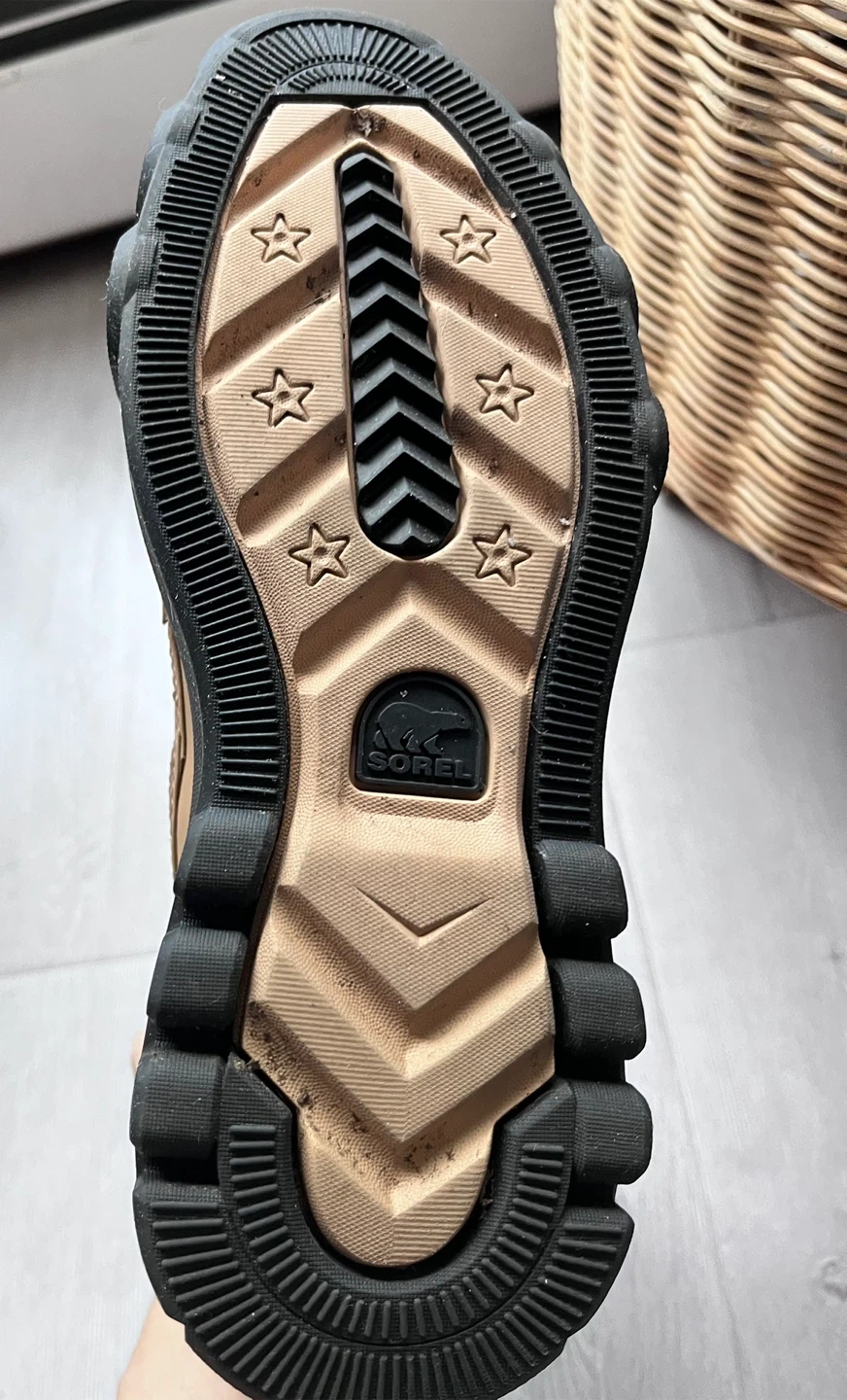 Size 7 . These Sorel boots are crafted from tan leather with elastic side panels for easy wear. They feature a durable black lug sole for great traction. Perfect for fall and winter weather!